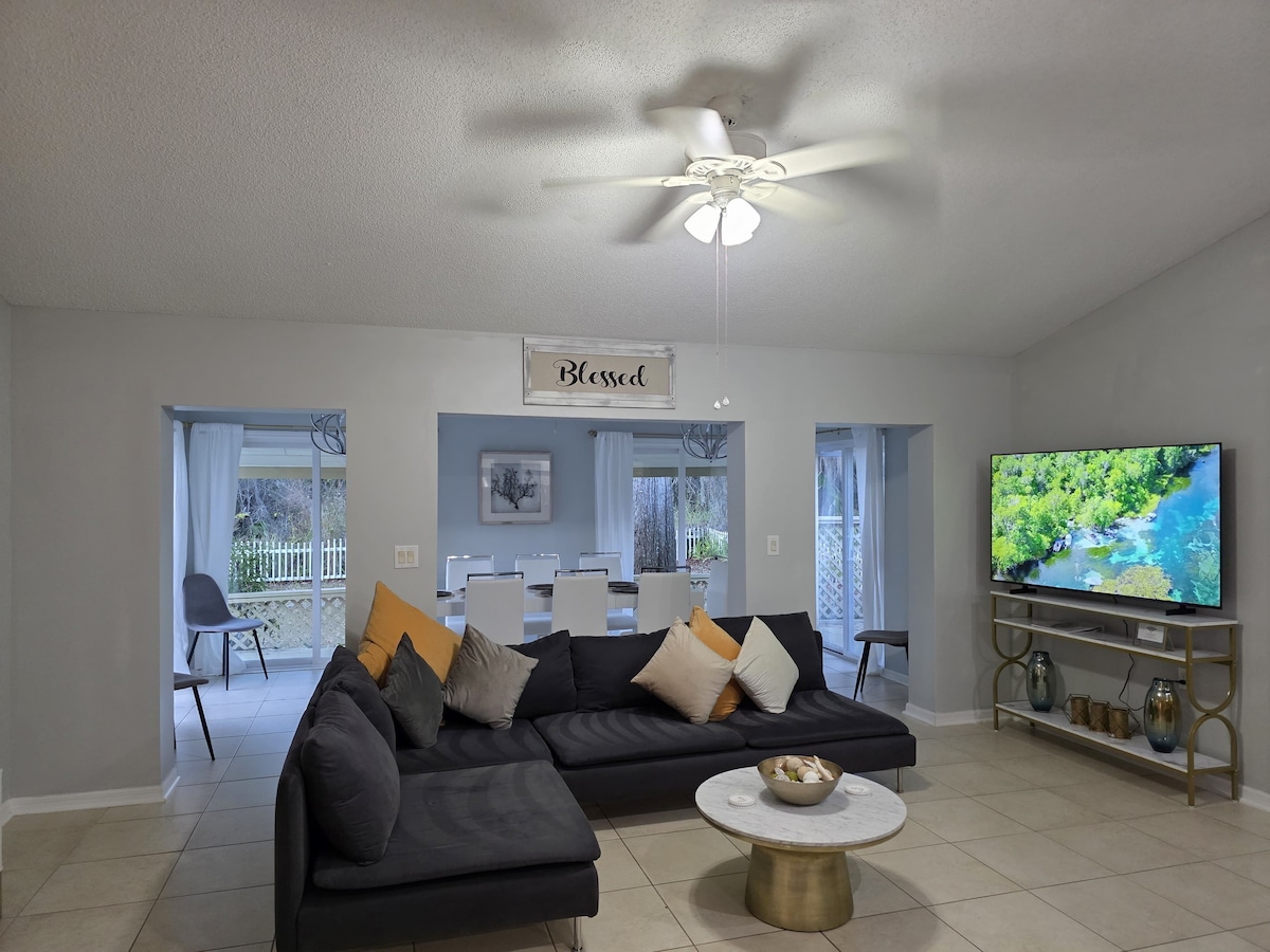 整個冬天免費使用82°溫水泳池!整套房源的傢俱都很舒適!寬敞的牧場風格房源,可舒適入住10人!備有充足的廚房用品和其他您可能忘記的物品!非常理想的泳池和陽台區域,非常適合閒逛!極佳的中心位置,靠近彩虹河、三姐妹泉、維基瓦治和魔鬼巢穴。安靜的街區,非常適合在與海牛划船、扇貝或甚至當地的汽船之旅後放鬆身心!