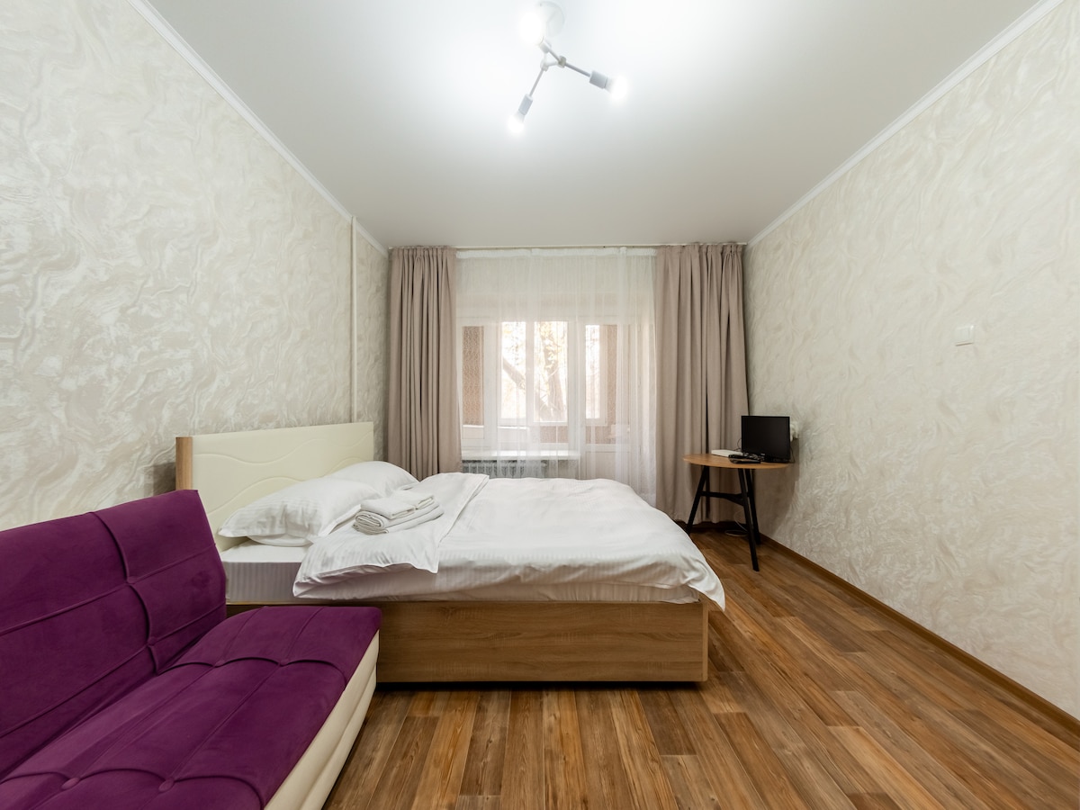 在我們舒適、時尚的地方玩得開心。 位於阿拉木圖市的現代化功能齊全的單間公寓,可供2-4人入住。適合嬰幼兒入住。全新翻修的整套房源配備您舒適住宿所需的一切設備。公寓設有設備齊全的廚房、WiFi和所有必要的設備。 公寓位於大型購物中心旁邊,有各式各樣的餐廳、咖啡廳和超市。 步行10分鐘即可抵達主要的城市步行街。