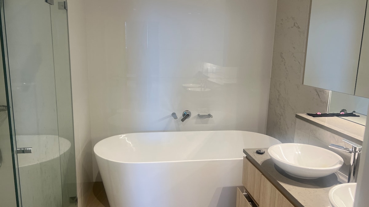 1. Refined & simple “A spacious bathtub with a beautiful sunset view.” 2. Airbnb-style descriptive “Enjoy a large soaking tub framed by an uninterrupted sunset view.” 3. Luxury tone “Featuring an oversized bathtub overlooking golden sunset horizons.” 4. Relaxed & inviting “Unwind in a generous bathtub while watching the sun melt into the skyline.”