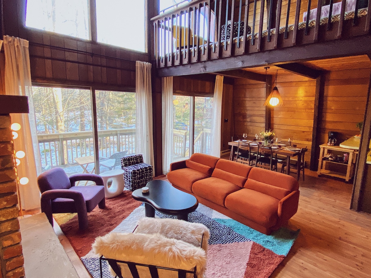 新增熱水浴缸! 這個小三角屋坐落在賓夕法尼亞州東北部的波科諾山脈的樹木之間,步行幾分鐘內即可抵達湖泊。 精心策劃,充滿中世紀家具、許多藝術品、書籍和唱片。 小屋的亮點是樓上的浴室,在Condé Nast、Houzz和West Elm中都有介紹,這是Pinterest夢想成真。 來在樹林間的美麗浸泡浴缸中浸泡一下。 距離紐約市2小時。