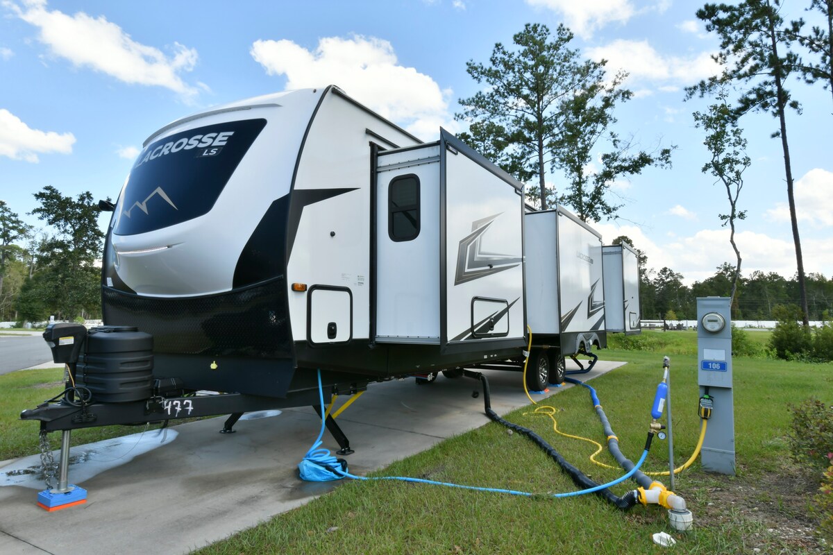 Discover the ultimate getaway in our 2024 Lacrosse. This luxurious camper boasts an island kitchen, spacious living with four slides, a king-size bedroom with an electric fireplace, and a cozy queen-size bedroom with a private half bath. Enjoy modern comforts like air conditioning, heating, a full-size refrigerator, and a microwave. We provide all essentials making it perfect for holidays with the out-of-town family members or a romantic retreat. We will deliver the camper to your campsite