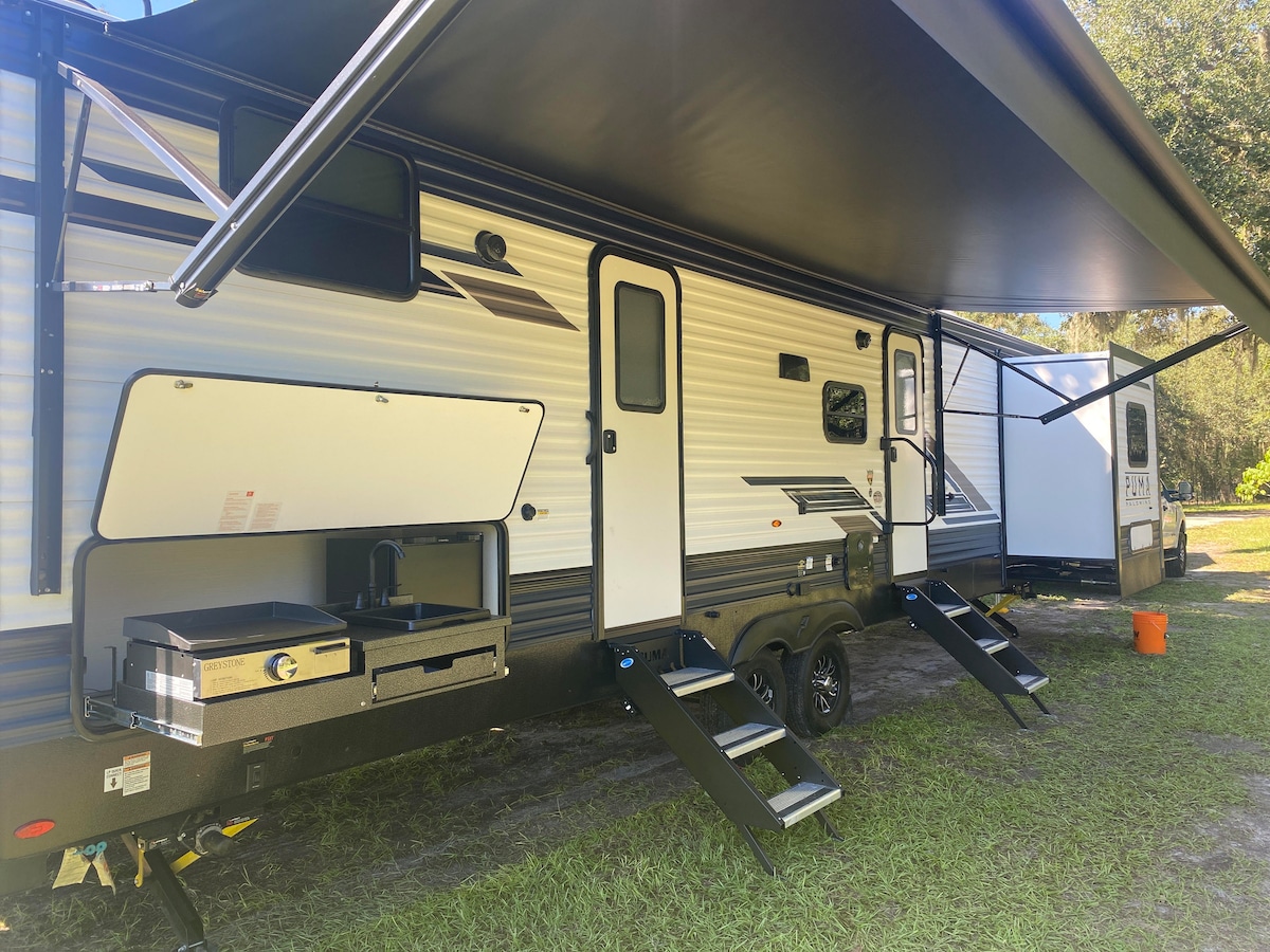 This camper is stylish as well as accommodating. The floorplan boasts a queen size bedroom with an ac unit to itself as well as a tv. The separate bunkroom that can sleep 5 comfortably and also has a tv, Xbox gaming system, and boardgames for the family. Two separate doors to enter the trailer, one to the living room and one to the bathroom. The outdoor kitchen is complete with a two-burner stove top, refrigerator, and a sink. Perfect for relaxing outside.