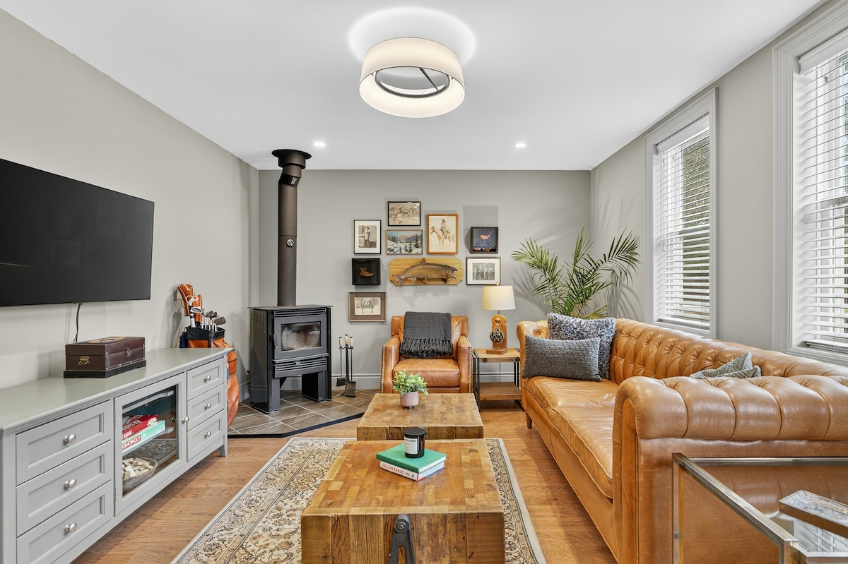 單位位於Living Stone Golf Resort旁邊,距離Collingwood市中心幾分鐘路程,距離Blue Mountain/Scandinave Spa 10分鐘路程。我們的翻新公寓提供現代時尚的優雅。享受625平方英尺的隱私,有兩間臥室和一間帶浴缸和淋浴的浴室。還有沙發、電壁爐、Netflix和基本有線電視、WiFi、套房洗衣機和烘乾機。室外露臺,可欣賞花園景觀。