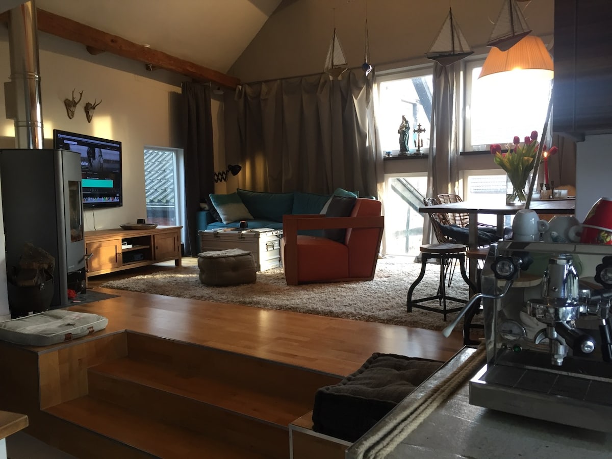 來找我們。這裡很棒。 我們家內的舒適客房-以前的穀倉。 靠近科隆和波恩。 大型天然花園。在景觀和自然保護區之間的綠地上享受美妙的夜晚休息。 太陽能系統為房子提供電力、熱水、暖氣的清潔能源。 提供電動車充電站和房客個人電腦。 我們在房子裡住著一隻貓和一隻狗。 乘坐大眾交通工具前往我們的房源有點複雜,但有可能。