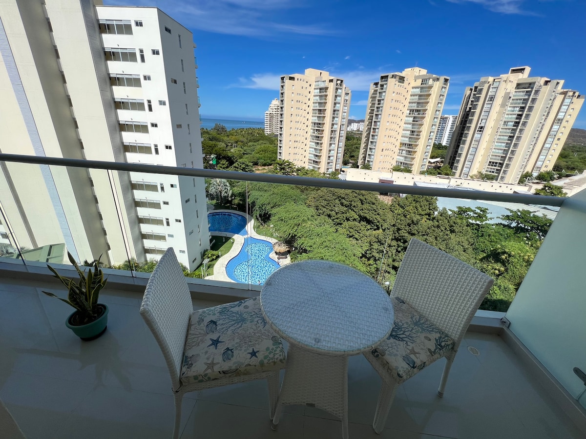 美麗時尚的28平方公尺公寓套房,配備安靜、獨立和舒適住宿所需的一切設備。非常適合情侶或高階主管入住。配有400兆Wi-Fi、智慧電視、空調、1間全功能浴室、方便使用筆記型電腦的區域、陽臺,可欣賞美麗的海景和泳池。配有可供您準備簡單餐點的空間、爐具、微波爐、咖啡機、三明治機和迷你吧。簡而言之,您需要逃離但仍與世界保持聯繫的一切。