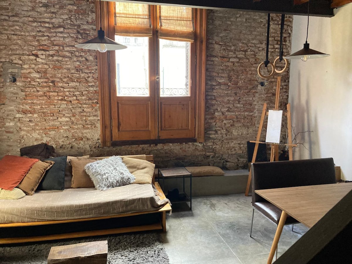 Apartamento "2" dentro de la antigua casona "El Patio de las Glicinas" totalmente reciclada. Loft con living y cocina integrados, y dormitorio en el piso superior. Ideal para parejas. Zona muy tranquila, segura y silenciosa frente a la plaza y cerca de tiendas y bancos, a pocas cuadras del barrio histórico y a una cuadra de la playa. Totalmente amueblado, con aire acondicionado en ambas plantas, televisor con reproductor Chromecast y cocina equipada con horno, microondas, cafetera y tostadora.