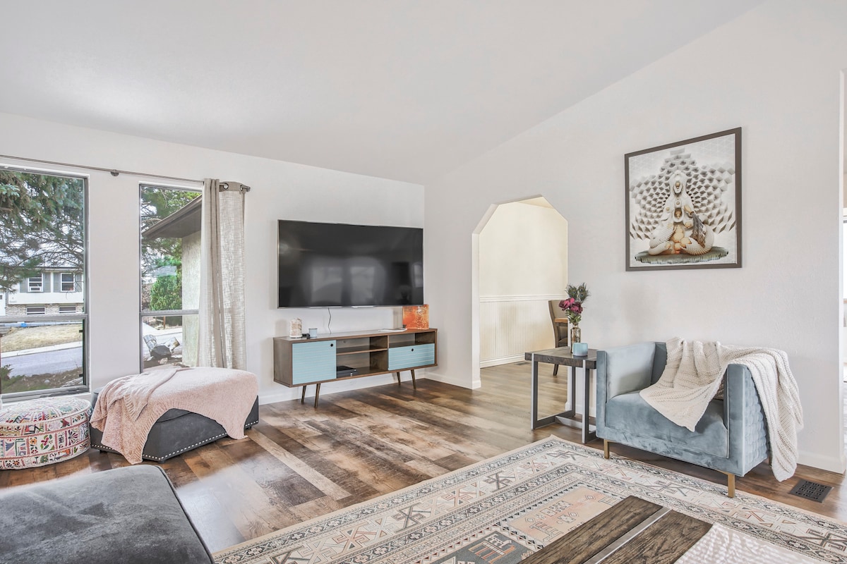 寬敞的四間臥室房源,配有兩間浴室和大院子,有遮蔽的後門廊、火坑和烤架。 設備➜齊全的廚房,配有洗碗機、攪拌機、攪拌機、鬆餅機、電鍋等。 ➜ 24小時無鑰匙入口 ➜ 寵物預訂-僅限2隻狗(請參閱下方規則) 客廳有➜75 吋智慧電視,可收看串流和當地頻道 ➜ 靠近I-25、卡森堡、世界競技場,開車前往眾神花園、派克峰、動物園等地只需很短的車程! ➜ 備有遊戲和拼圖,供家庭娛樂!