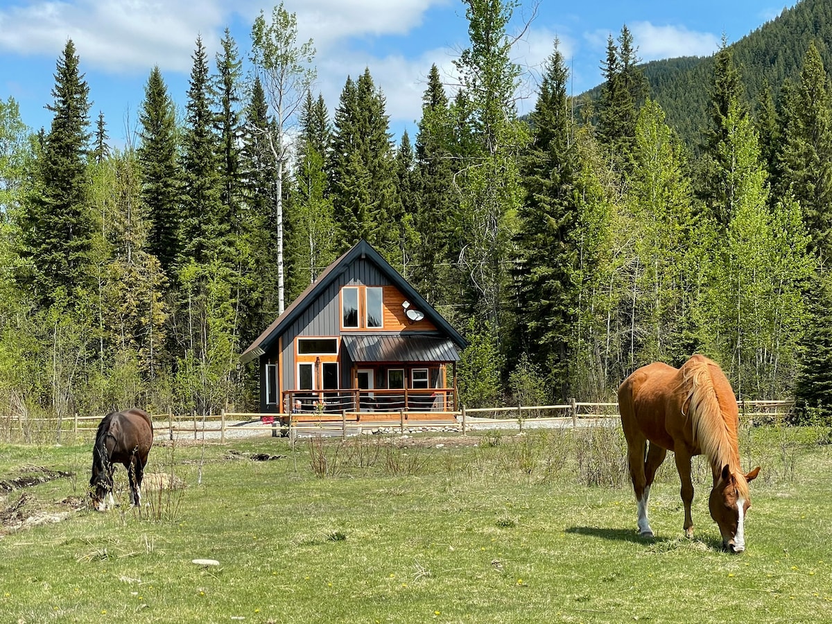 這間新建的小木屋是為了欣賞山景而設計的! 明亮通風,配備現代化設備與服務和質樸的細節。 每扇窗戶都有令人印象深刻的山峰,美麗的山草地,馬匹在吃草,背景是珀塞爾山脈。 非常適合2對夫婦或小家庭入住。 距離Golden最新景點「Skybridge」僅幾分鐘路程,開車前往Kicking Horse Mountain Resort和4個國家公園也很方便。 是您所有山地冒險的完美家庭基地。