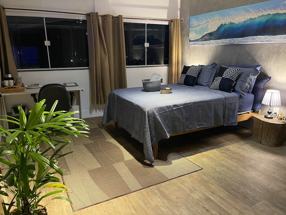 Our accommodation was designed to provide you with maximum comfort and convenience during your stay! Flat 804, measuring 28 m², accommodates up to 2 people and consists of: Comfortable king-size bed with split air conditioning, Minibar, microwave, water filter, coffee maker, Iron, 32" TV, Wi-Fi and laptop table. In addition, it has a large balcony with a table and 2 chairs with views of the city and Imbetiba Beach.