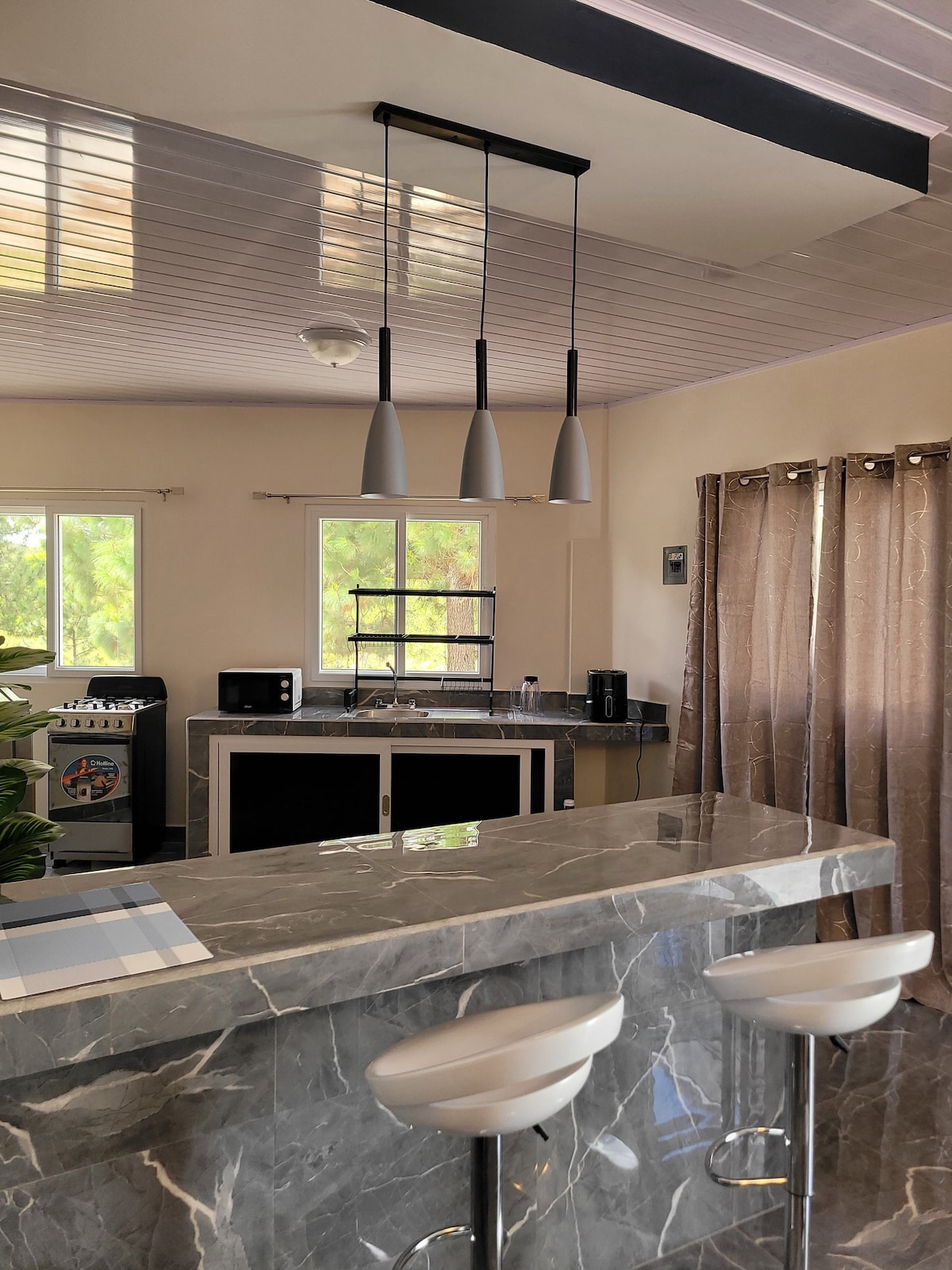 華麗的套房公寓超越所有舒適性...堅固的枕頭牀墊、乾淨柔軟的牀上用品、熱水淋浴間、有線電視、Wi-Fi、空調、冰箱、烹飪爐、吊扇、微波爐、客廳設備、可欣賞山景的陽臺、私人停車位和絕對衛生。