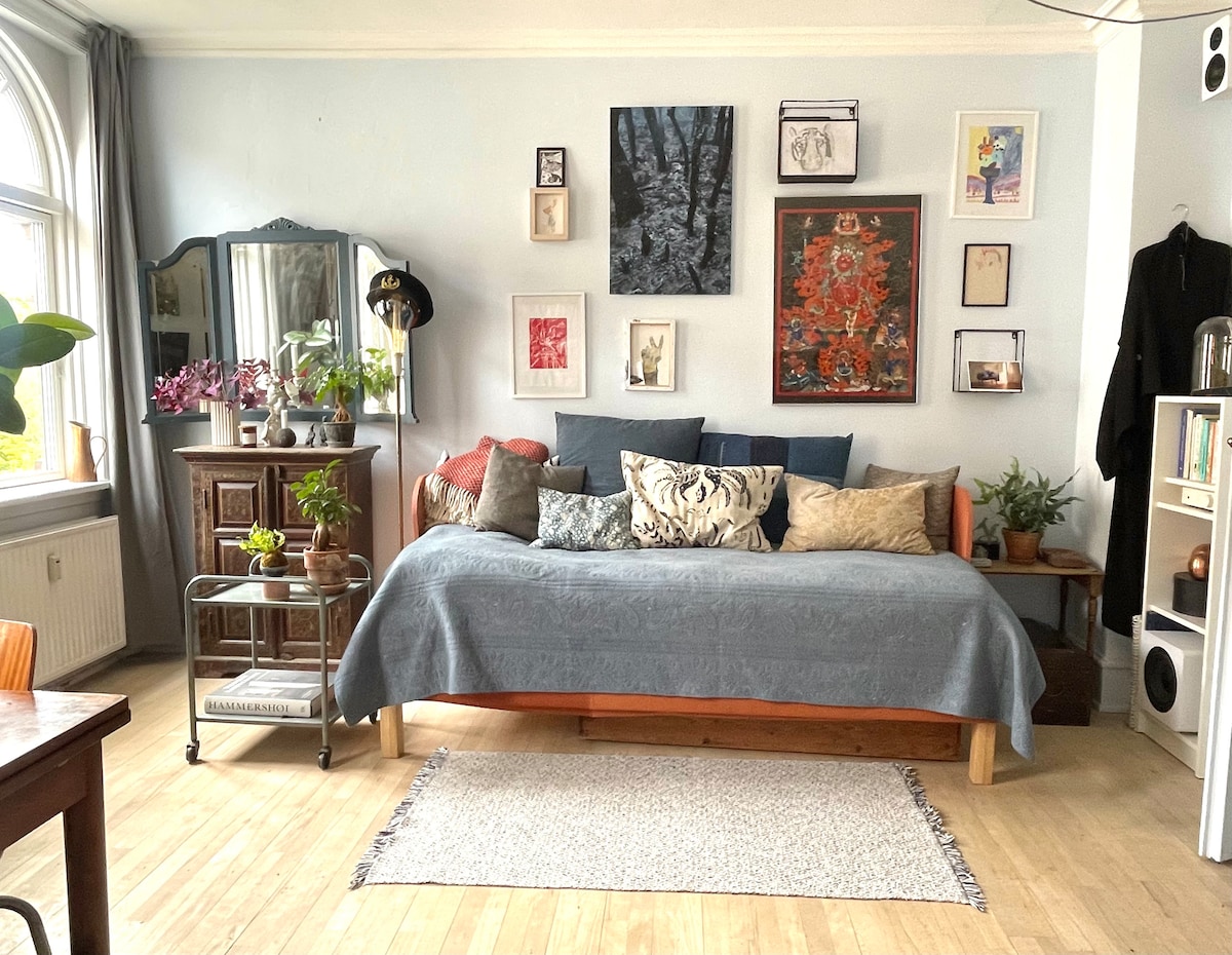歡迎來到我們位於Vesterbro最好的舒適公寓!旁邊有一個可愛的綠色廣場、一個很棒的遊樂場,附近有很多很酷的當地咖啡廳和酒吧。 我們的家有貓Smilla和一些友好的植物,在您入住期間只需要稍微照顧一下。 💚 公寓位於一棟舊房子裡,有點古怪(走廊有點破舊,廚房有點小),但一切都很好。它還有一個可愛的陽臺,被一棵大楓樹遮蔭 🌳
