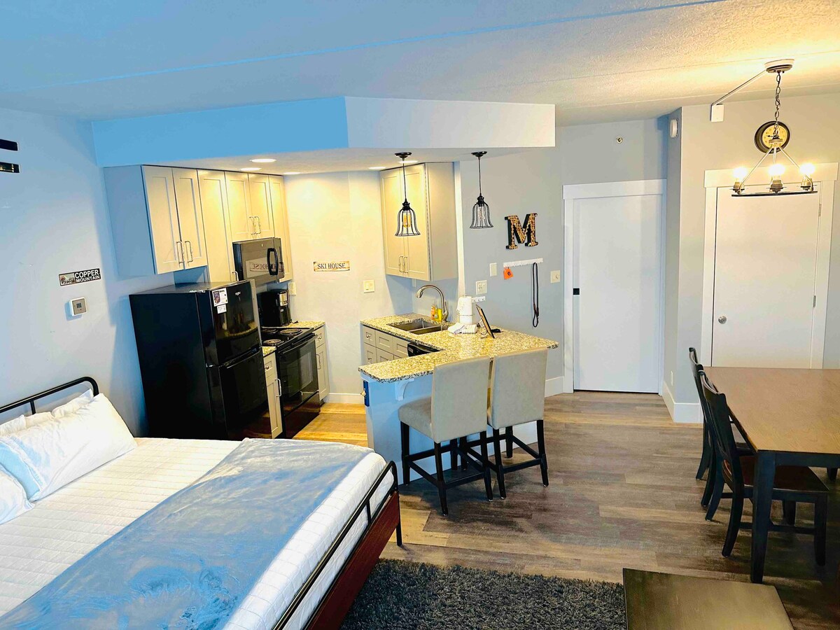 入住我們位於銅山(Copper Mountain)全新翻修的寬敞滑雪公寓,體驗終極放鬆。步行 5 分鐘即可抵達山坡,您將能充分利用在山上的時間!在公共按摩浴缸和桑拿房中放鬆身心,並享受同一棟大樓內餐廳的便利。坐落在 Copper 的中心村,距離 Copper 的所有餐廳和商店都只有幾步之遙。在陽臺外的 10 英里小溪的舒緩聲音中入睡和醒來時,面對驚人的日出。