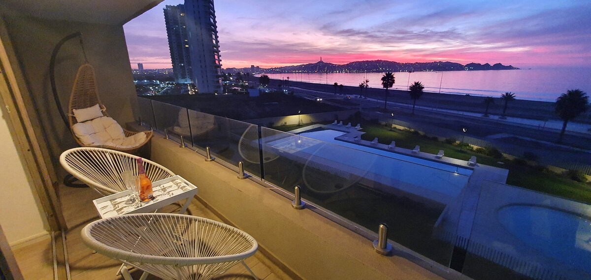 Hermoso Dpto.3 dorm. 2 baños y 1 estacionamiento en primera linea frente al mar con una hermosa vista despejada a toda la bahía. Depto. mejor ubicado del edificio. Full equipado con todas las comodidades, WiFi, Cocina, horno, refrigerador, Smart TVs, cable, parlante Bluetooth, 1 cama 2 pzas, 1 cama 1 pza, 2 camas 1.5 pzas. Piscina, ascensor y acceso controlado. No incluye sabanas ni toallas. No se aceptan mascotas. Prohibido Fumar. Opción Sabanas y toallas de ducha por $40.000.- adicional
