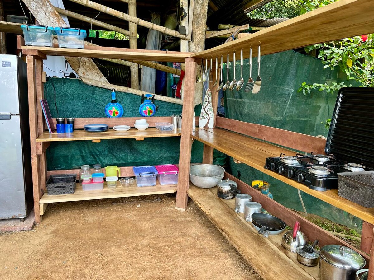Relax surrounded by nature in all directions. Our rustic cabin features a beautiful view looking out over the mountains and gulf, which will leave you calmer as soon as you sit down. We're located just 10 minutes outside of town and 10 minutes to the beach, secluded up in the peaceful mountains with nature on all sides. We are a full old-school BnB with traditional Tico breakfast included (& other meals available for purchase). Our two cabins share a fully equipped outdoor kitchen.