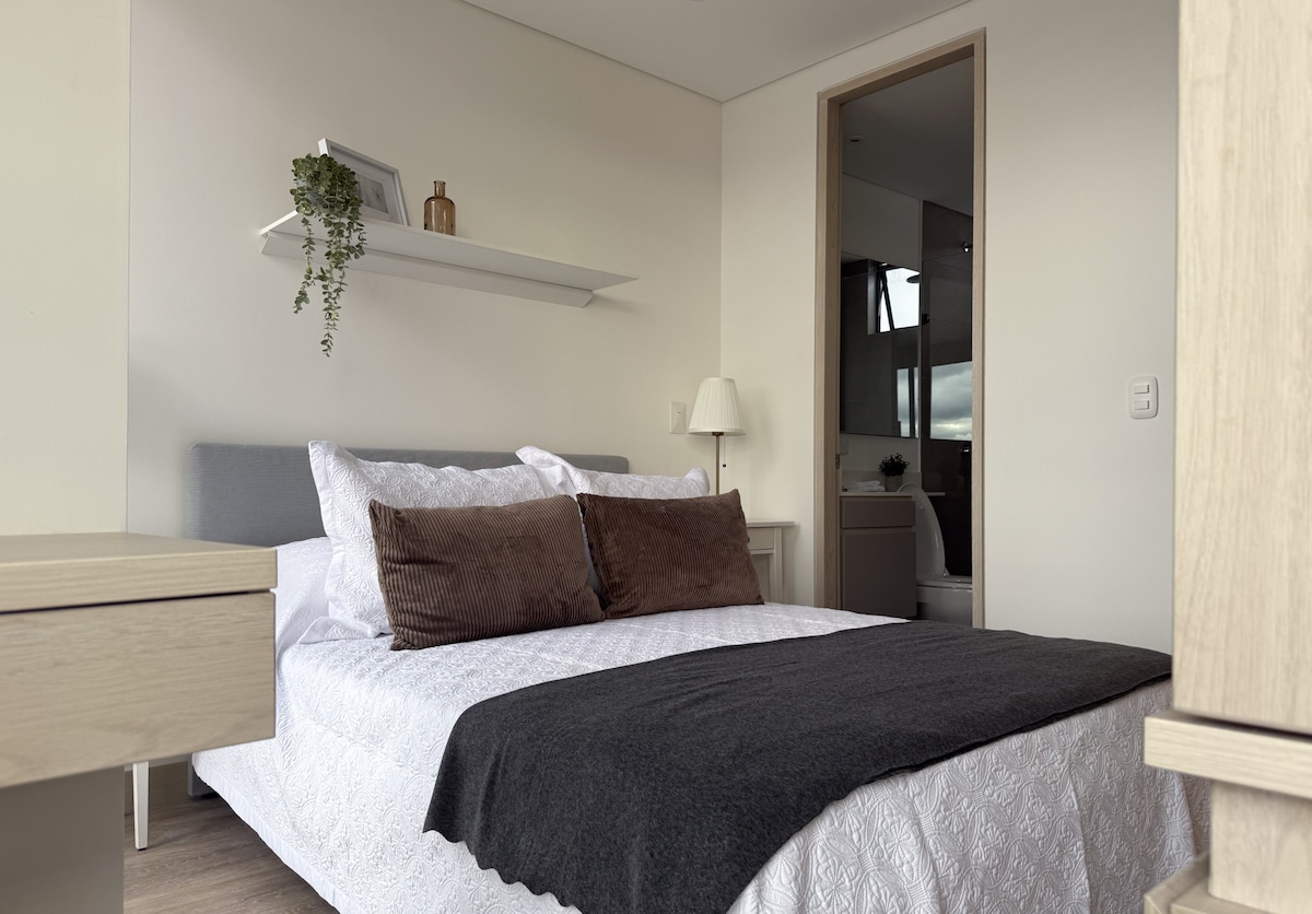 適合商務或情侶的單間公寓。舒適且環保的設計(太陽能熱水器、衛生間使用雨水、高效照明)、非常舒適的床、寬敞且光線充足的工作空間,以及設備齊全的廚房。它位於 Corferias(3 個街區)、國立大學(4 個街區)和美國大使館附近,步行 15 分鐘即可抵達。 乘坐計程車不到 20 分鐘或乘坐公共交通工具 30 分鐘即可抵達機場。