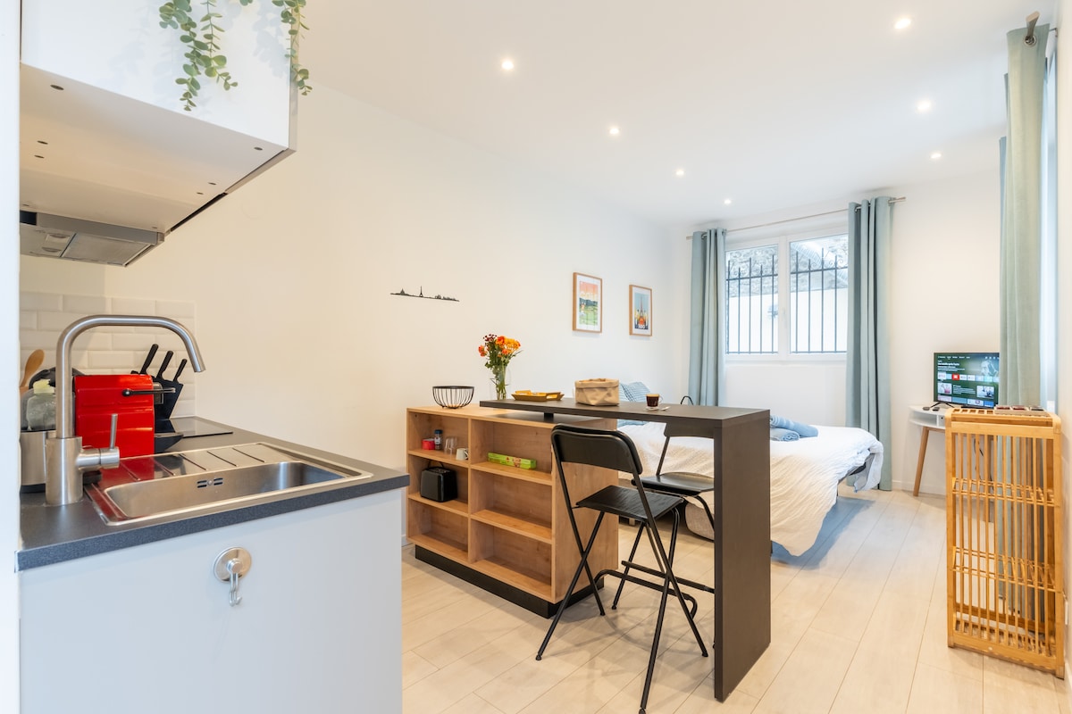 🌟 Chez Marie:32 平方公尺的藍色單間公寓,全新翻修——超級方便 📍 RER 火車站 5 分鐘(巴黎市中心 20 分鐘),提供停車位 💻 光纖 WiFi + 智慧電視 🛏️ 小號小號 🍳 Nespresso、電磁爐 寬敞的🚿淋浴間 🎯 遊客/潛在客戶展現消費能力 ✅ 自助入住、專業床單