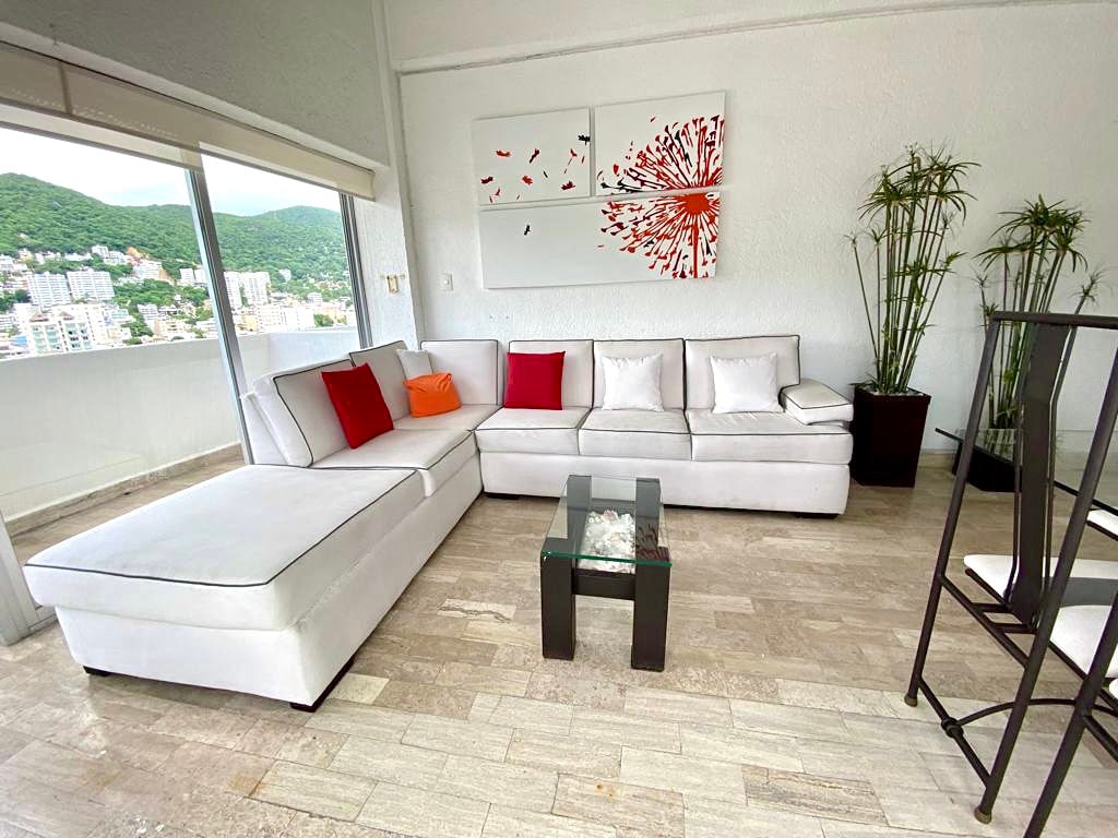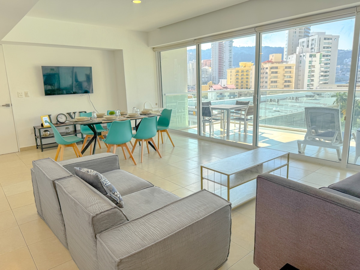 The interior of the apartment has no damage from OTIS and JOHN. Spacious 4-BR luxury beachfront apartment, EXCLUSIVE FOR FAMILIES, with a huge double balcony, stands out for its unbeatable view of the paradisiacal Acapulco Bay, large pool, and beach club. Includes daily maid service (hotel-style). 100 meters of beachfront with exclusive-use palapas, a pool with a slide, a wading area for kids, and restaurant/bar service. The 4 bedrooms have mini-splits and private bathrooms.