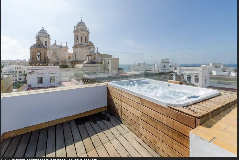 Stunning 2 bedroom apartment with FULL BEDS in the heart of Cádiz. Two large private terraces & jacuzzi where to relax enjoying amazing views of the Cathedral Bright and airy penthouse set in a new building with marble floors & cozy decoration. Centrally located at Plaza de la Catedral and Market. Many restaurants and shops around Beach: 10 minutes away. Parking available at AV CAMPO DEL SUR, 15 COST: 15 eu/day