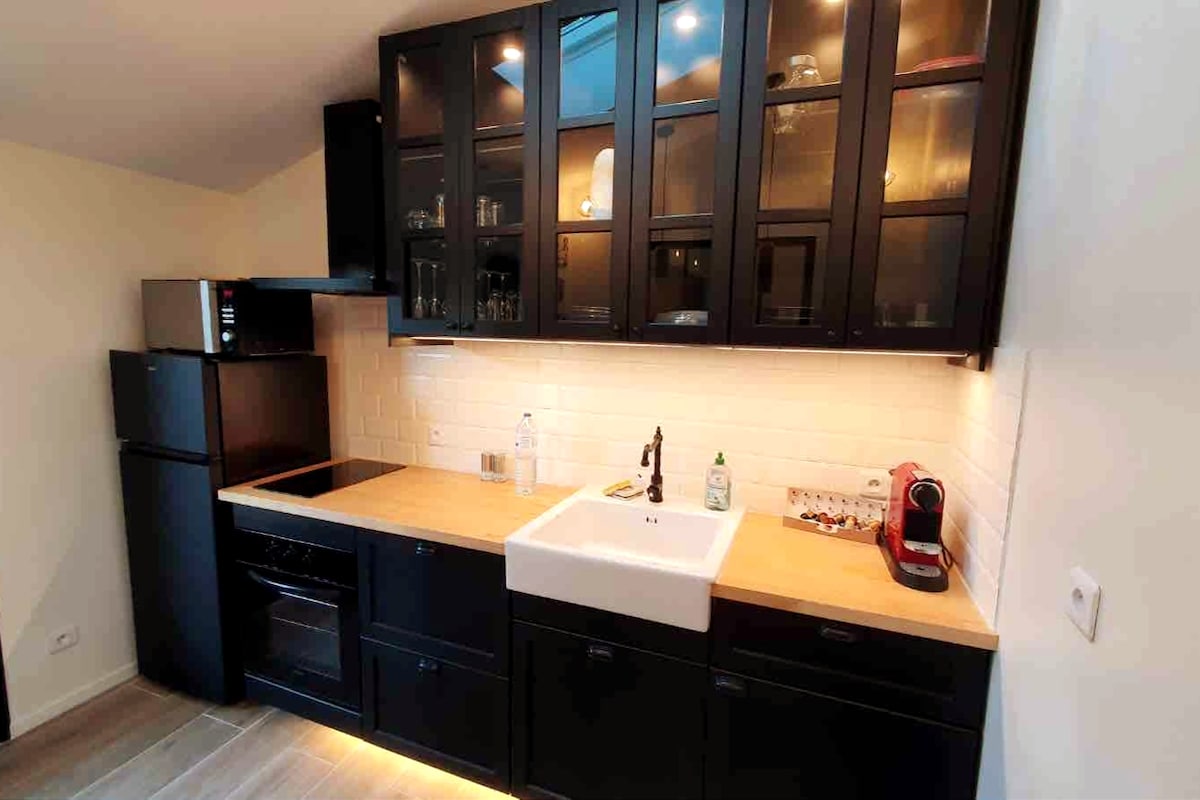 Charmant four à pain ancien en colombages, situé en bord de ruisseau il se compose de : - Salon avec un poêle à bois, - Cuisine, - A l’étage : -salle de douche/WC accessible par une échelle de meunier (voir photos), -chambre avec un lit 160x200 avec vue sur le ruisseau, accessible par une échelle de meunier (voir photos), Chambre et salle de bain ne communiquent pas. Salon de jardin, BBQ, parking privé, bois de chauffage inclus Note autre gite, la Maison de pierres, est à 100m
