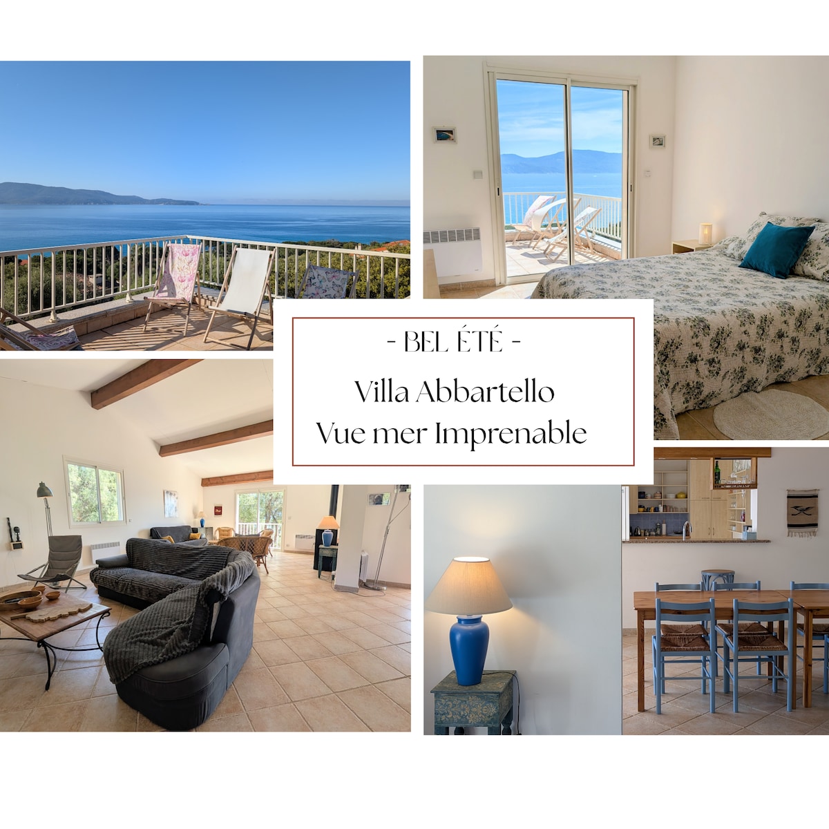Maison avec piscine chauffée et vue mer depuis toutes les pièces, proposant 3 chambres et pouvant accueillir 6 personnes. Magnifique terrasse couverte permettant de manger à l'extérieur à l'ombre à chaque repas. Tous les soirs, bénéficiez du magnifique spectacle du coucher de soleil ! Rive Sud d'Ajaccio, à 20 minutes de l'aéroport, sur les hauteurs de la plage d'Agosta, à 3 minutes en voiture des commerces, de la plage et des activités nautiques.