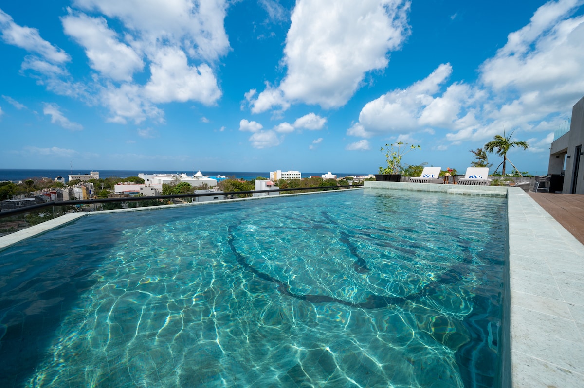 - Oceanview roof w/pool, gym, sun chairs, shaded dining, area to prepare drinks/snacks - Kitchenette with all the basics, new appliances, a coffee maker, in & outdoor seating - Good WiFi for streaming & working remotely, a laptop-friendly workspace, TV, A/C - ½ block to the famous 5th Ave, bars, nightlife and the beach - Don’t wait to reserve your stay in Playa del Carmen in the heart of the action!