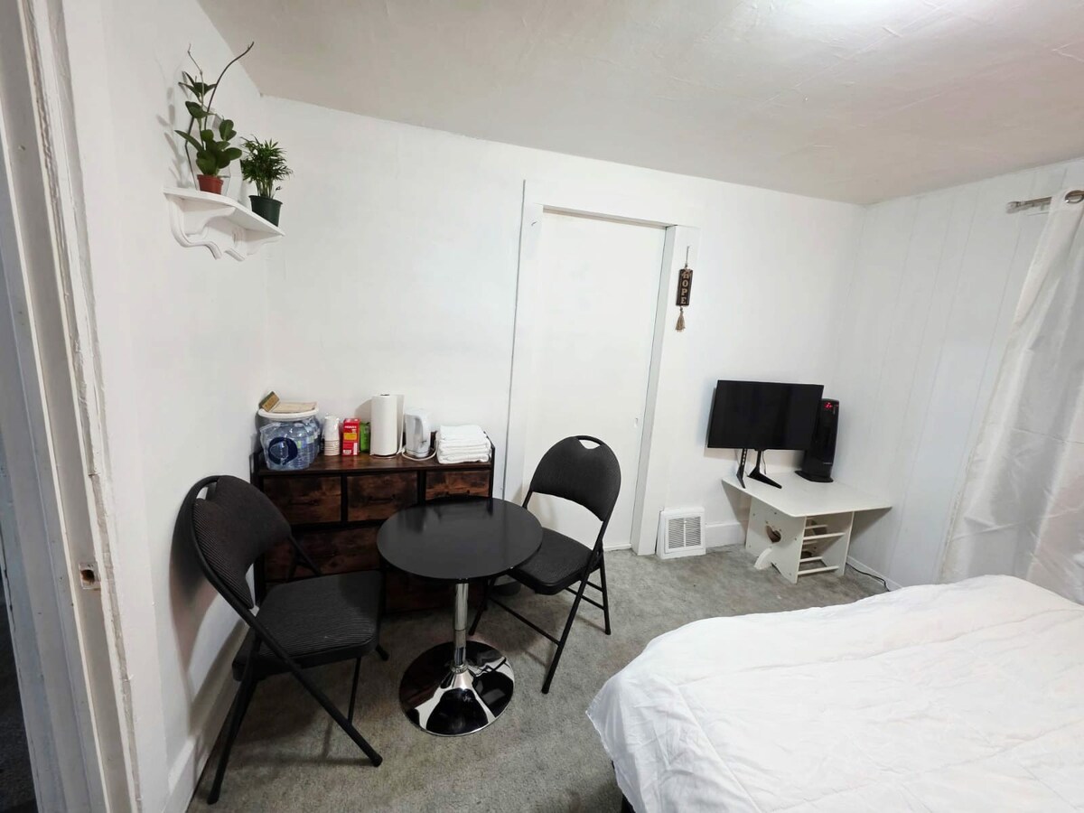 Our studio style hotel room is completed with new flooring and furniture. Includes a queen bed, side table, shared kitchen, dresser, free Wi-Fi, cable tv, and a side chair. Free parking with room for trailers, and a backyard space. We do require photo ID to be sent via Airbnb messages to verify your identification before you’re able to access the property.