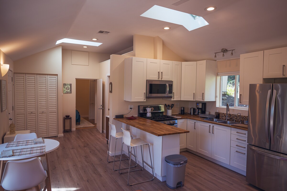 (Feb 2025- The Topanga village and homes were spared from the Palisades fire) Welcome to Orchard House Retreat! This 700 sqft private house is in an ancient oak forest in Topanga Canyon near Topanga State Park, the village and the beach! It’s a charming 1 bedroom 1 bath with a cozy living/dining space, modern kitchen and a deck. There’s a well stocked kitchen and orchard. Please note there are two sets of stairs up to the Retreat so being able to climb stairs is necessary. Please see photos.