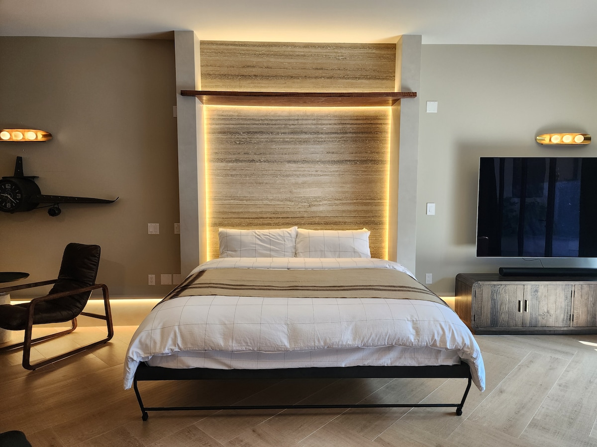 A zen & contemporary studio nestled around a 50-year+ old coral tree. This space embodies California indoor /outdoor living, with oversized custom doors that open to a beautiful outside space with a dining table, reading nook, BBQ & fire-pit. Full kitchen. Queen bed in small nook with barn doors for privacy & king bed in our low-ceiling upstairs loft area. Sofa bed & 70" TV in living room. The secluded studio is in a quiet neighborhood in Marina Del Rey, close to Venice Beach, Playa Vista & LAX.
