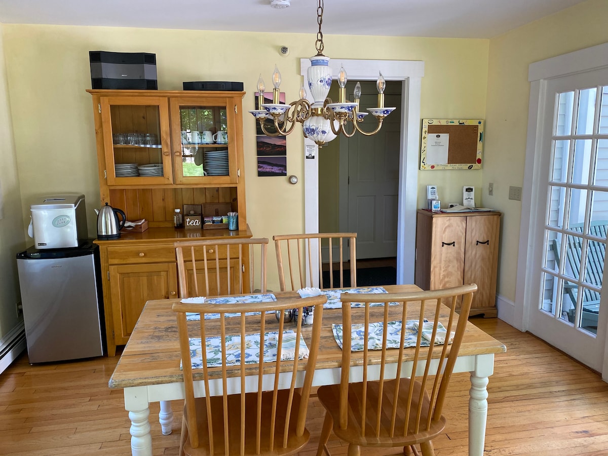 The Captain Bagley room is located in the beautifully restored Bliss Farm Inn in Durham, Maine. Built in 1772, this room is named for O. Israel Bagley, the original builder of the house and one of the first settler's of our town. The room boasts a very large, but detached, private bathroom, electric fireplace, fully stocked guest fridge, and luxurious linens. Included in your stay is a full continental breakfast as well as a farm-to-table hot entree, 24/7 snacks and beverages, and evening sherry