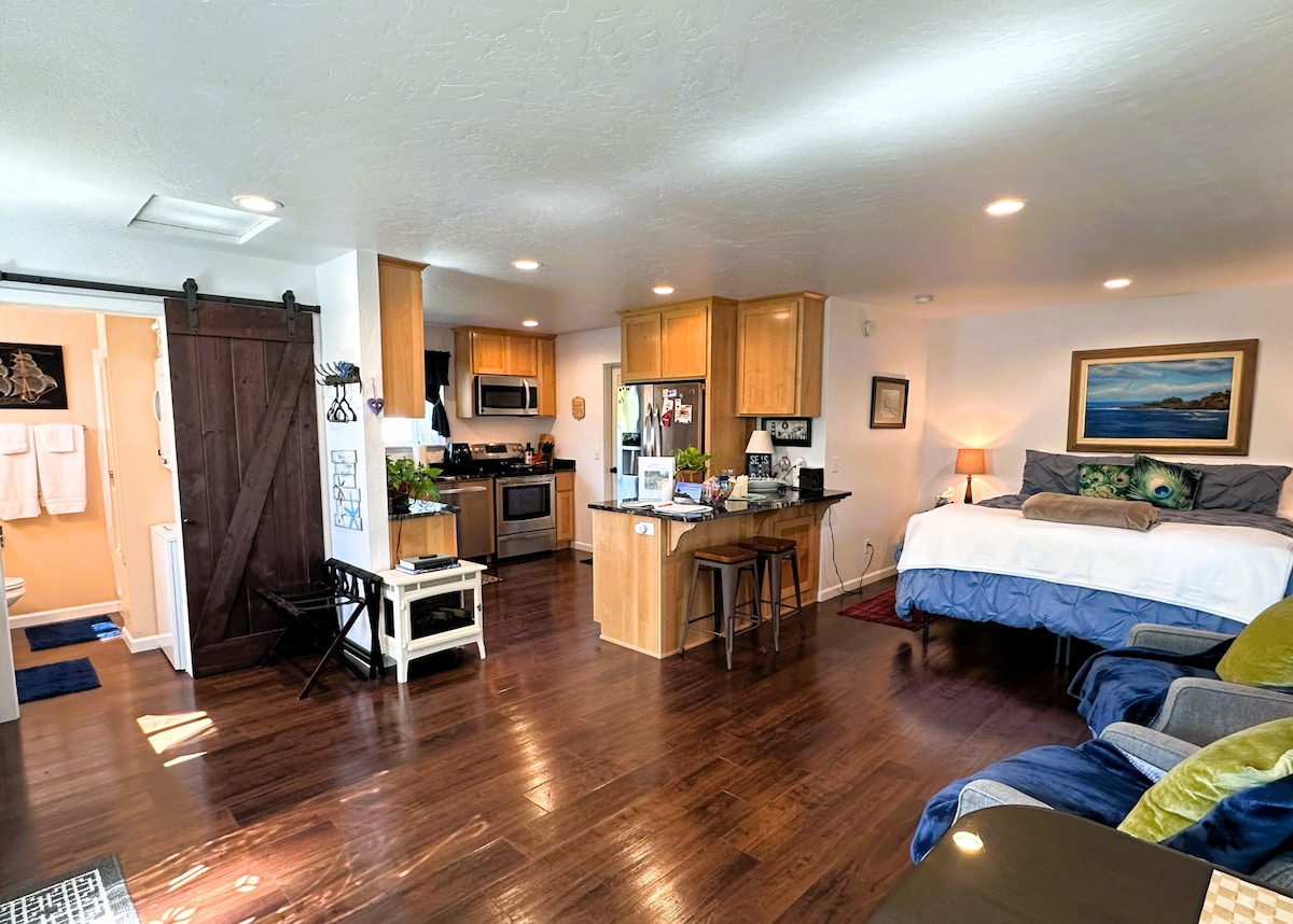 我們家庭房屋後面的舒適客用住房,具有迷人的現代農舍風格、舒適的床上用品(最多可供4人入住)、設備齊全的小廚房,以及為我們的電動車房客提供的1級充電器。靠近布魯金斯餐廳/商店,開車短時間即可抵達迷人的海灘、步道、切特科河、紅木林,步行短時間即可抵達杜鵑花公園(Azalea Park)(有2個遊樂場、漂亮的花園/步道、飛盤高爾夫球場、球場/球場、夏季免費音樂會和冬季熱門燈光秀)。