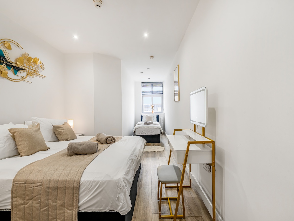 Spacious 2-bed, 2-bath apartment in Leicester city centre, perfect for up to 7 guests. This modern retreat on Highcross Street features an open-plan living area, a dedicated workspace with Wi-Fi, smart TVs and a fully equipped kitchen. Ideal for families, groups, and business travellers looking for a comfortable and convenient base to explore the city. Enjoy hotel-quality linen and a seamless self-check-in experience.