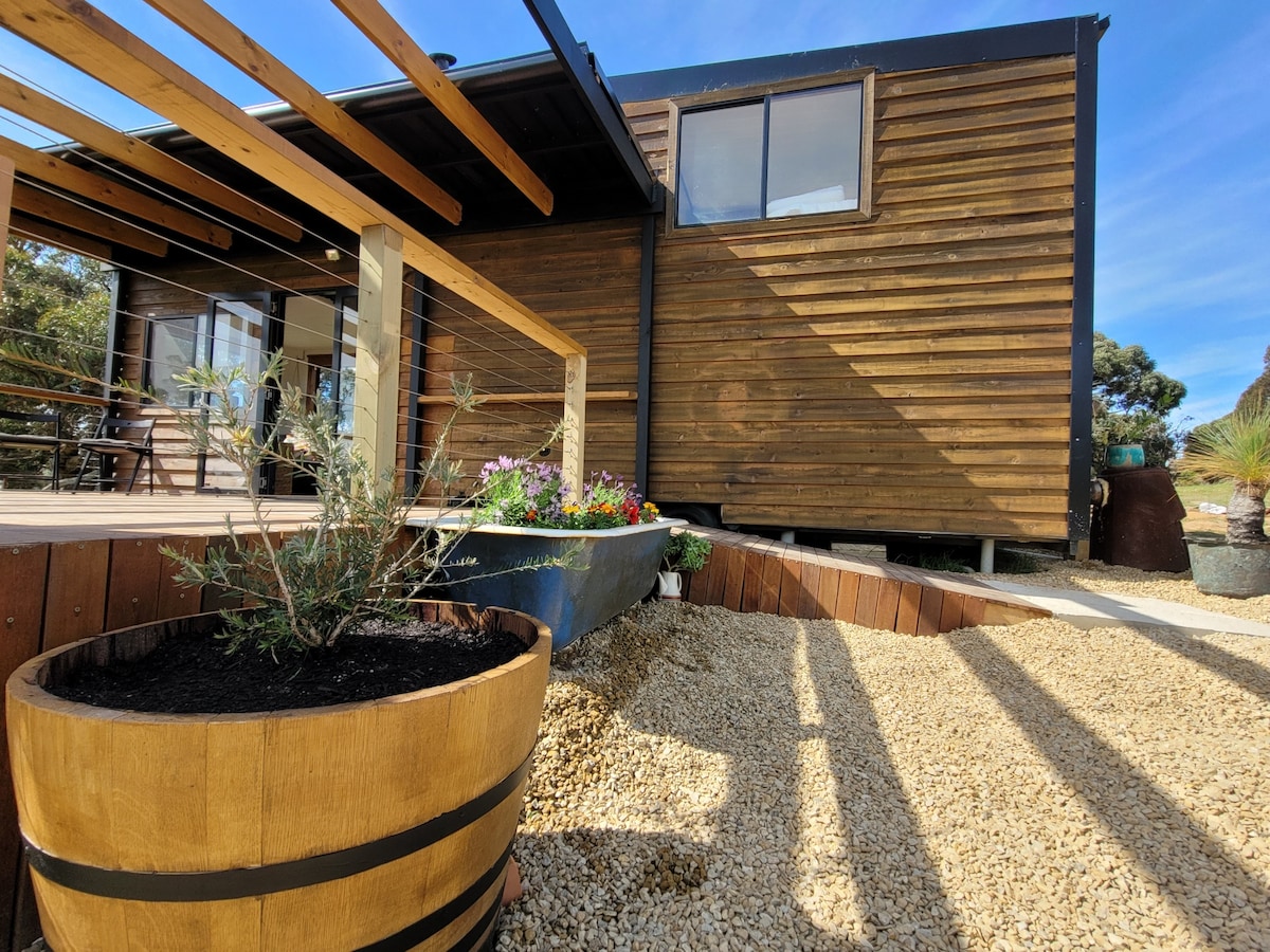 Discover an architecturally designed Tiny Eco House, steps away from Victor Harbor, Pt Elliot, and nearby beaches. Luxurious interiors, modern amenities, a projector, and an outdoor bathtub await. Nestled on a scenic hillside with stunning views of Hindmarsh River and McCracken Hill, this property features a beautiful garden with meandering stairways and paths leading to a top deck for your perfect retreat