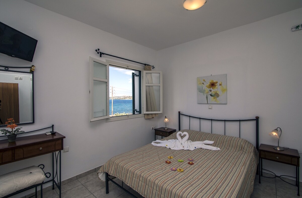 The Deluxe Suite with Sea View (40 m²) is a spacious one-bedroom suite, comfortably accommodating up to four guests. Featuring a private entrance, the suite includes a bedroom with a king-size bed, an open-plan area with a dining table and a fully equipped kitchenette, two single sofa beds, and a modern bathroom with shower. Guests can enjoy two private balconies, offering exceptional panoramic views of the Aegean Sea, the perfect setting for relaxation at any time of day.