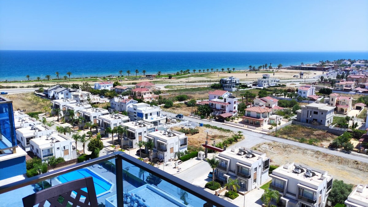 配有陽臺的豪華單間公寓(泳池和海景)。 您可以使用度假村酒店的所有設施,包括室內和室外遊泳池、水療中心、桑拿、土耳其浴室、按摩沙龍、健身房、理髮店、酒吧、餐廳。 步行5分鐘即可抵達YENİ ISKELE (長灘)最好的海灘。