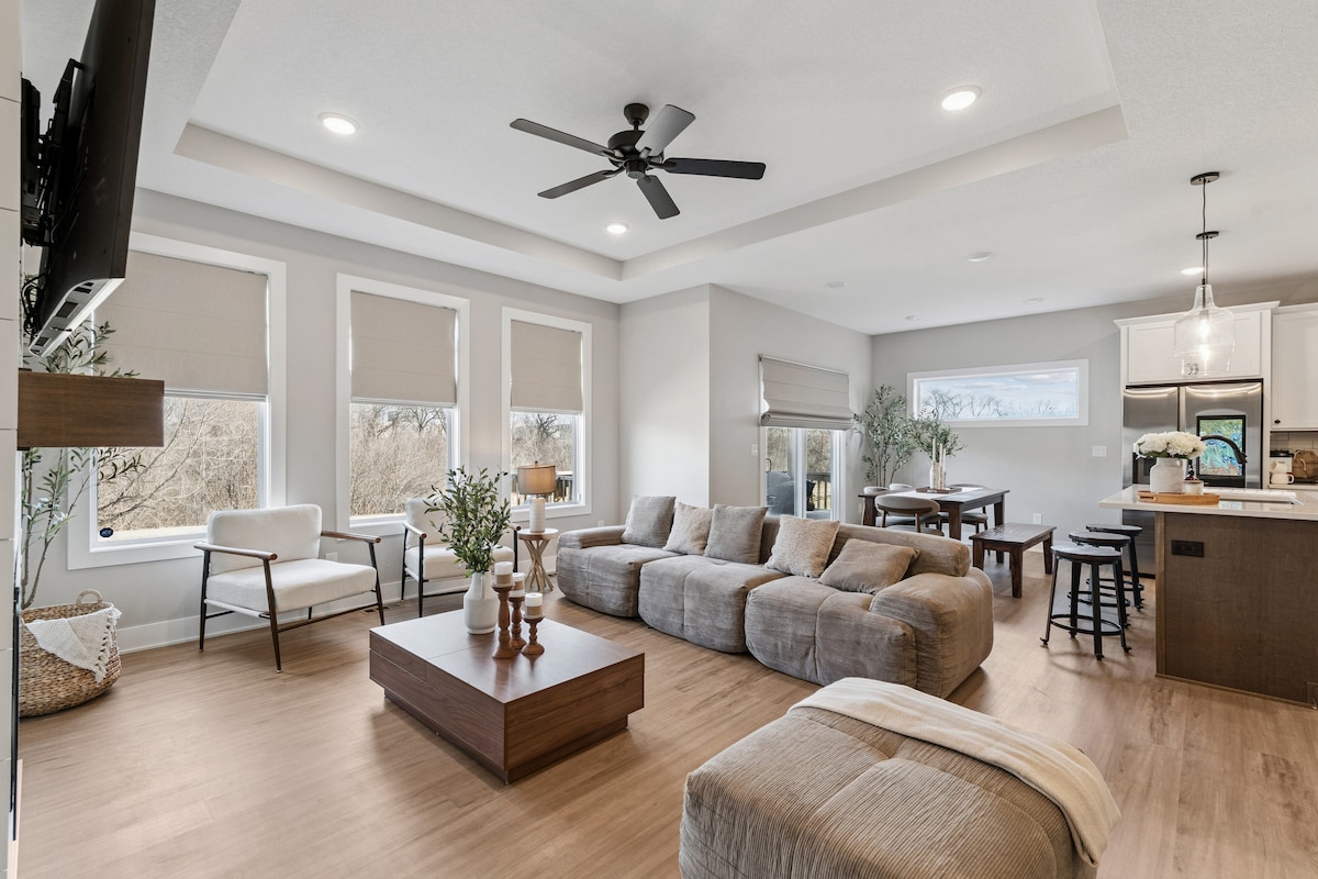 我們寬敞的房源,最多可容納10人,配有廚師廚房、安靜的辦公室、快速網路、舒適的床和五間浴室。在私人林木後院享受戶外樂趣,在露臺上用餐,與孩子們一起踢足球,坐在火坑旁製作棉花糖。 核桃溪區域公園和自行車道0.8英里。星巴克/Hy-Vee Fast&Fresh 1.2 英里。,Target(雜貨店)3.1英里。,生活歷史農場4.6英里。,Vibrant Music Hall - 6.7 英里。富國銀行競技場14.5英里。