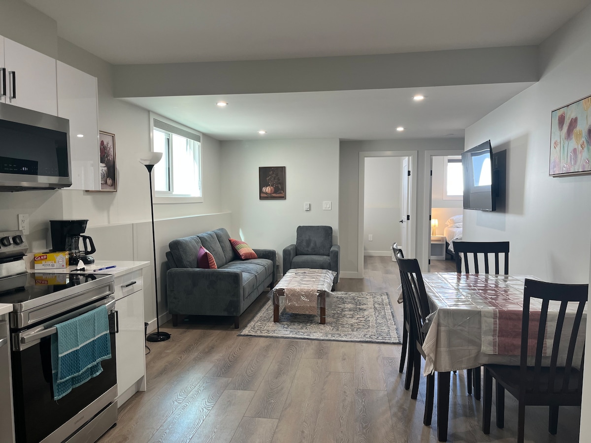 歡迎來到我們迷人的地下室套房,非常適合旅客、情侶或專業人士。享受獨立入口、舒適的臥室、全套浴室、配備家具的客廳和設備齊全的廚房,方便您使用。配備洗衣機和烘衣機的洗衣房,讓您的生活更加輕鬆。此空間距離市機場僅 5 分鐘路程,提供舒適、私密的空間,並可輕鬆前往當地景點。立即預訂住宿,享受寧靜便利的度假勝地,我們期待接待您!