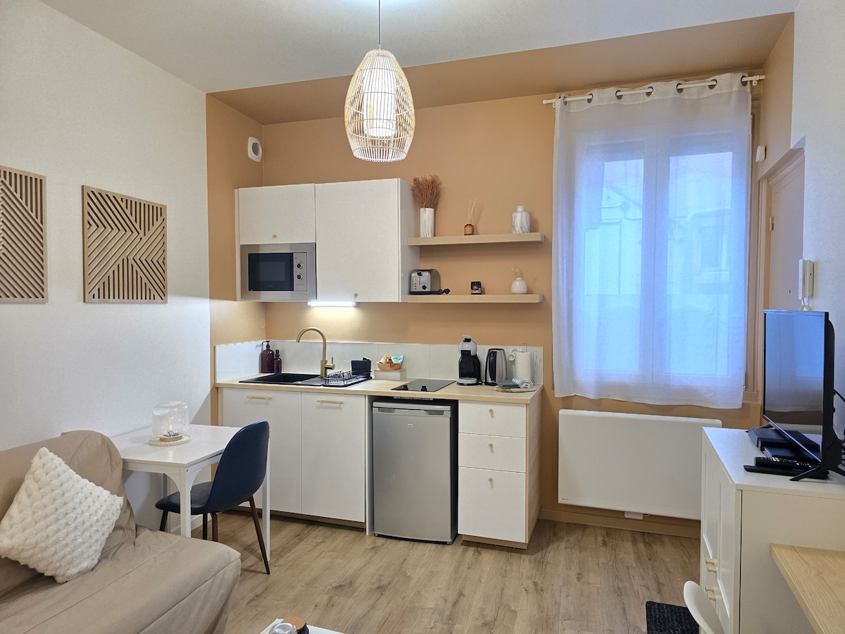 Bienvenue à Dijon, je propose en location un studio/T1 (26m2) rénové dans une petite rue calme, tout en étant proche de la gare, du centre ville, de la cité de la gastronomie et du jardin botanique de l'arquebuse. Vous trouverez un espace cuisine - salon- salle à manger ; un espace nuit isolé par deux portes coulissantes et une salle de bain attenante avec douche. Il est idéal pour 2 personnes mais peut accueillir jusqu'à 4 couchages avec le canapé convertible du salon en complément.