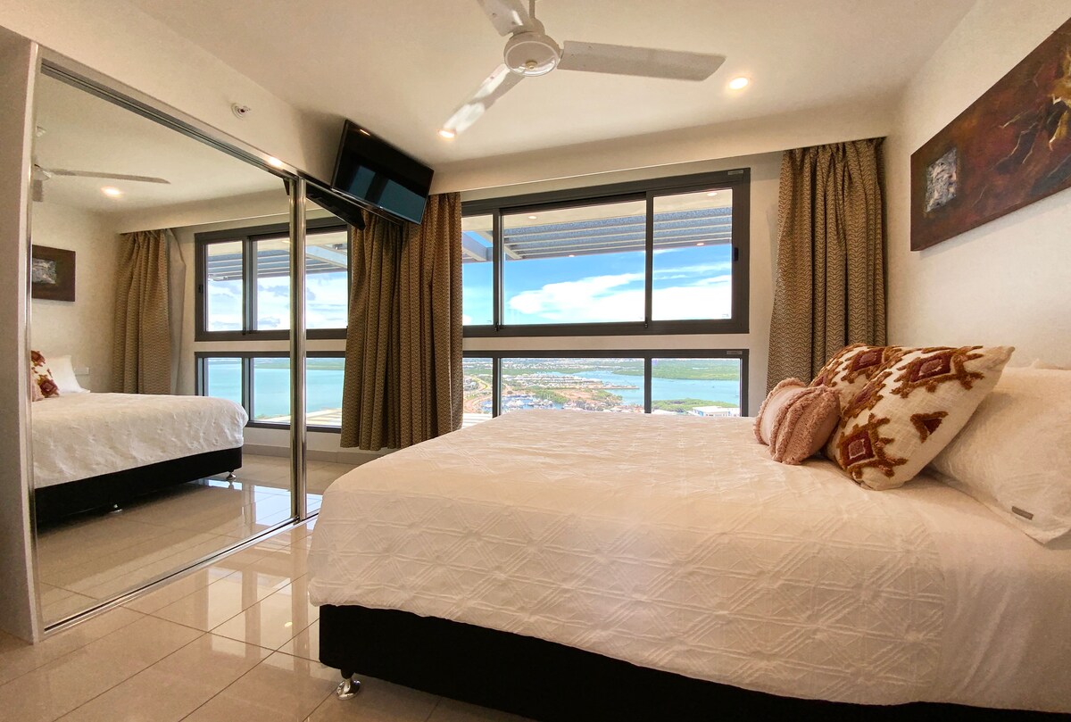 這間角落的頂層公寓坐落在NT最高的酒店Mantra Pandanas的27樓,邀請您從上方體驗達爾文。 享受日出和日落的美景,欣賞港口和城市景觀。 擁有3間臥室、豪華主套房、大理石套房、135平方公尺的精緻起居室和47平方公尺的環繞式陽台,是這一層最大的住宅–位於中央商務區中心的寧靜、明亮的度假勝地。