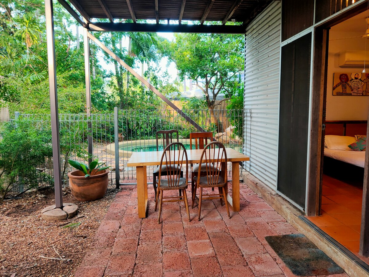 舒適的加大雙人牀,配有優質的棉質牀單。 峇裏島柚木家具。小型套房,包括熱高壓淋浴間、洗手盆和馬桶。 潟湖式泳池。公共廚房、健身房、洗衣房。 位於Parap Village ,距離達爾文中央商務區1公裏,可供參觀、更多餐廳和景點。 Mindal海灘市場、賭場、植物園、亞歷山大湖、East Point小徑和海灘、博物館和美術館。 位於Parap的中心-咖啡館、藝術、工藝、週六市場。