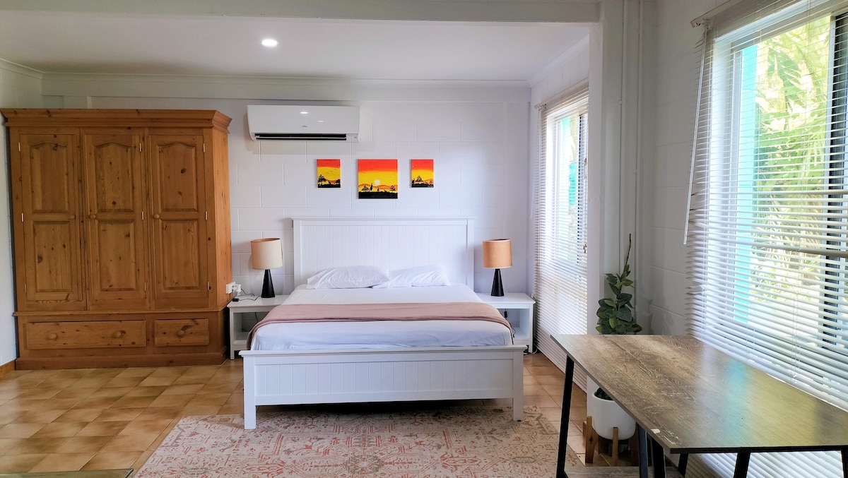 Modern brand new studio apartment under elevated house. House is situated in quiet neighbourhood street with lush tropical gardens. Large living space boasts comfortable king size bed, kitchenette and 50" tv. Kitchen is fully supplied with kitchen utensils, plates and cooking equipment to keep you self contained. Outdoor table and chairs also available. Stylish 3x3 bathroom with large shower and well lit open space. Bathroom also has seperate side door which opens up to small inground pool.