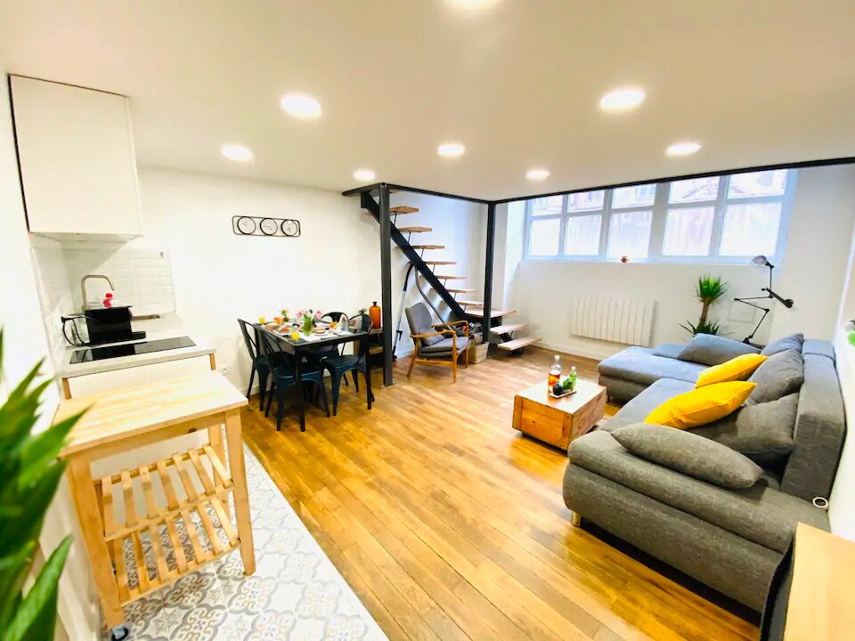 LYON SWEET HOME Loft climatisé centre ville Classé meublé de tourisme ⭐️⭐️⭐️ TERRASSE verdure Propre calme cosy Accueil par Nicolas, sinon boite à clé. NI BRUIT NI FÊTE NI SOIRÉE OCCUPATION PAISIBLE RESPECT DES VOISINS Triplex 13 COUCHAGES max +1 bébé idéal 8-10 Lits faits Serviettes fournies Ménage inclus 1 sdb 2 douches 2 WC Enceintes Netflix Fibre très haut débit Rhône à 500m Métros B/D TRAM T1 à 400m PETIT GARAGE à 350m Boissons chaudes et fraîches à dispo Sel, poivre, huile, ...
