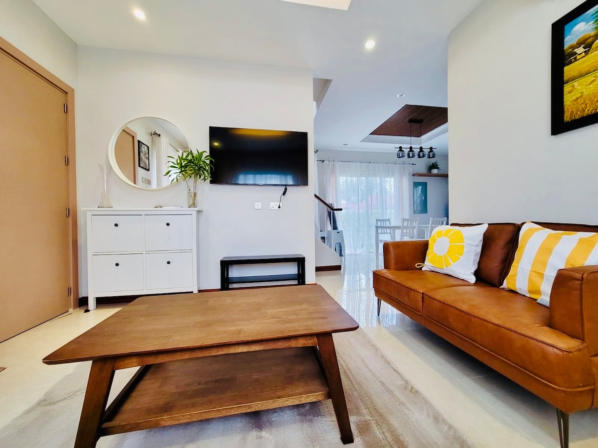 便利設備 *整套房源的專有使用權 *免費WiFi *烤肉區 *家庭泳池 *許多停車位 *飲水機 *冰箱配有「敲兩次,請參閱內部」技術 *微波爐 *烤麵包機 *廚房用具(盤子、湯匙、玻璃杯和其他廚具) *每日更換牀單和枕頭 *紙牌遊戲/棋盤遊戲 * Videoke * 4間臥室( 1間主臥室,配有自己的CR , 2張標準雙人牀臥室, 1間配有雙人標準雙人牀臥室) * 3間浴室 *花園露臺 * 76吋電視