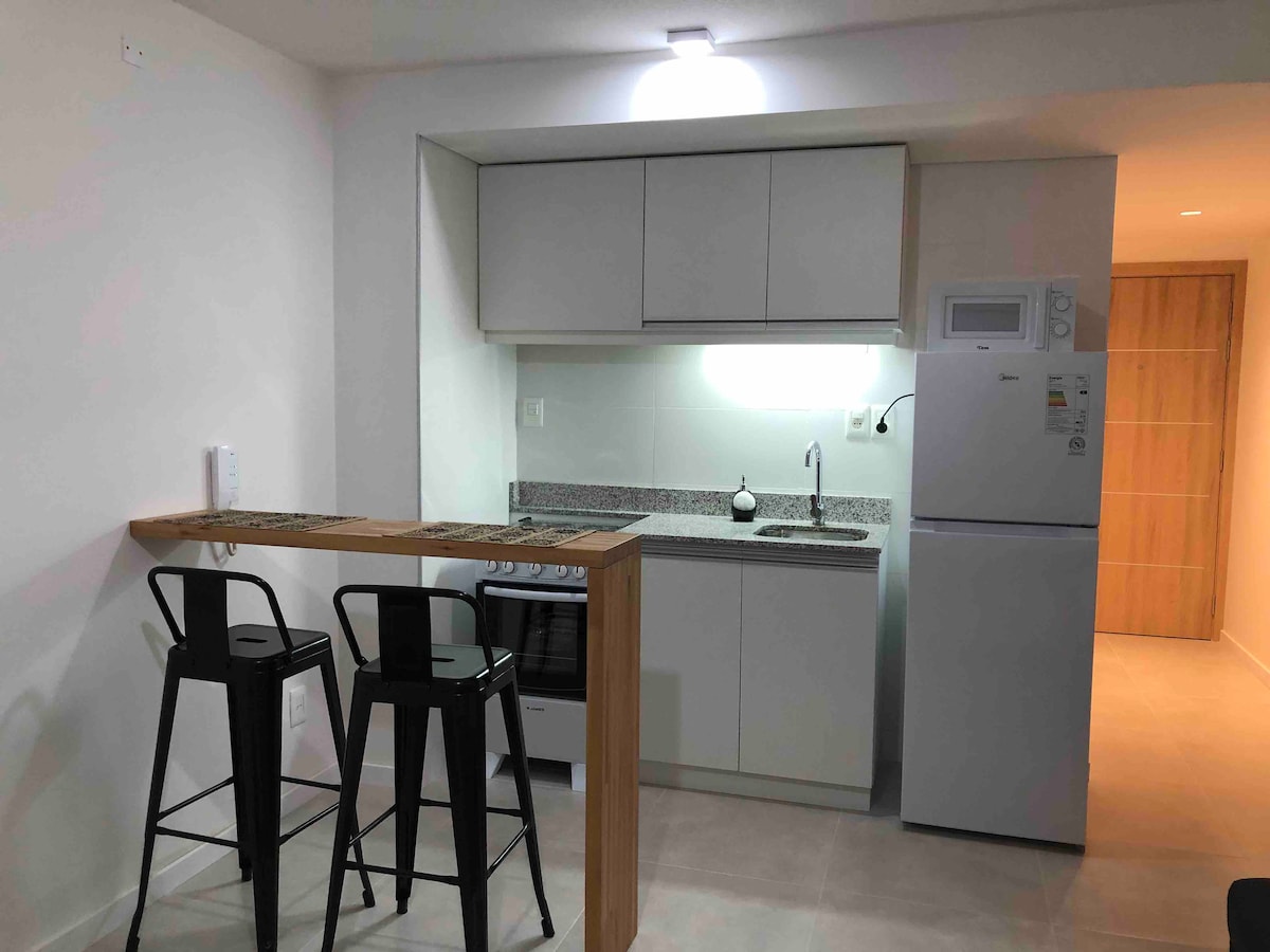 Relájate en este espacio tan tranquilo y céntrico. Apartamento práctico, a estrenar, luminoso en planta baja. Al Frente de una calle muy tranquila.Totalmente equipado: heladera con frezer, tostadora, microondas, jarra eléctrica, cafetera de prensa,horno eléctrico empotrado,anafe,campana extractora,smart TV, Aire acondicionado, plancha y secador de pelo.Estar con cocina integrada y dormitorio en suite. Baño Completo.El edificio cuenta con una terraza con parrillero.