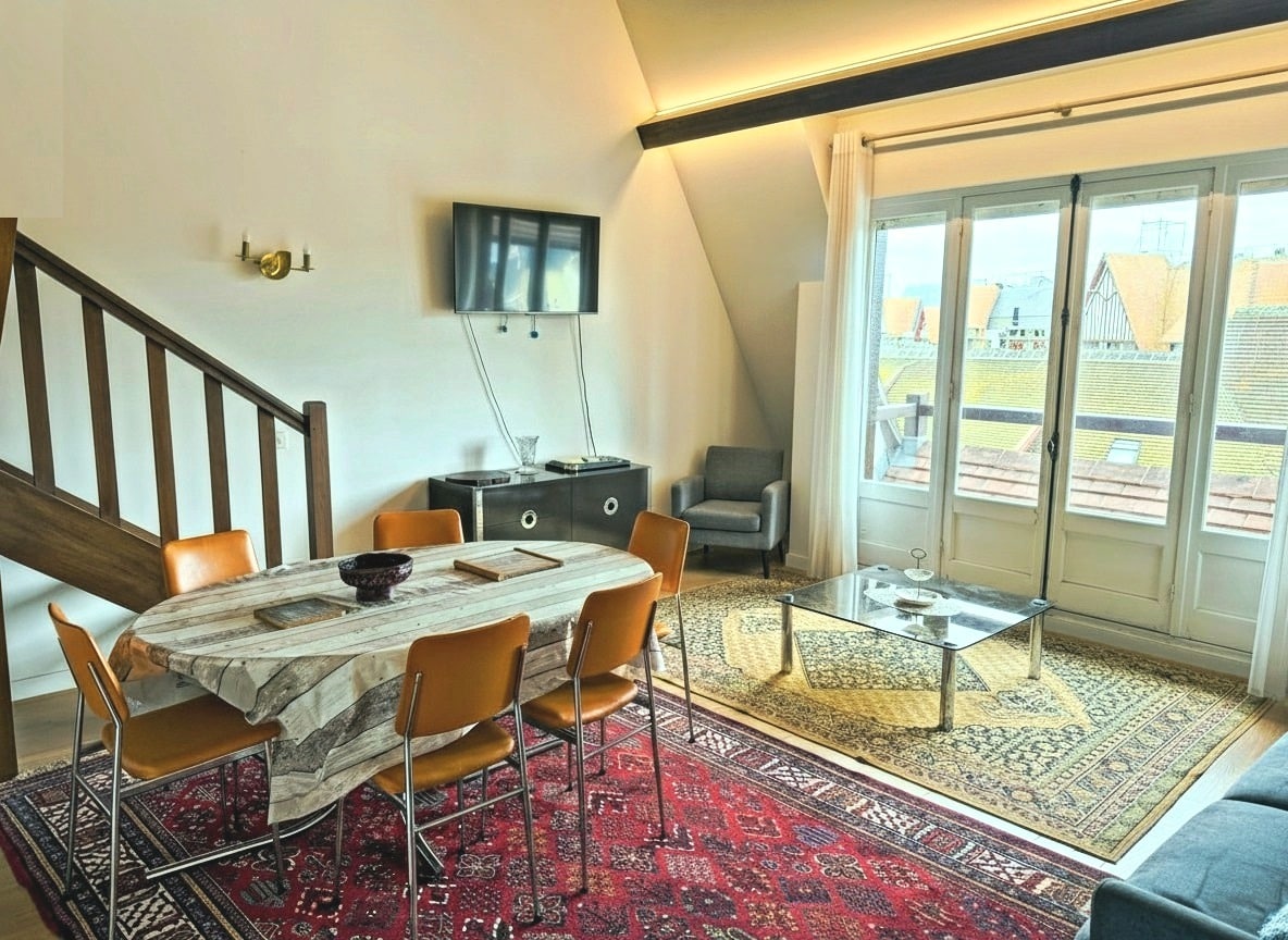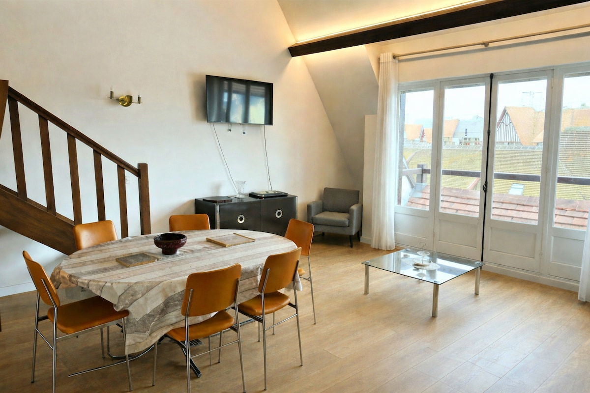 逃到我們位於多維爾市中心的光輝複式公寓! 11月全面翻新,享受這間可愛、設備精良的40平方公尺公寓,擁有2間套房臥室和一間精緻的客廳,配有開放式廚房和美麗的景觀。 這間頂樓非常安靜的複式公寓沐浴在自然光中,提供最多可容納4位房客的寧靜時尚的生活空間。 **位置** 火車站:350公尺-步行4分鐘 Place Morny : 230公尺-步行2分鐘 海灘:900公尺-步行10分鐘 禁止吸煙,不適合動物入住