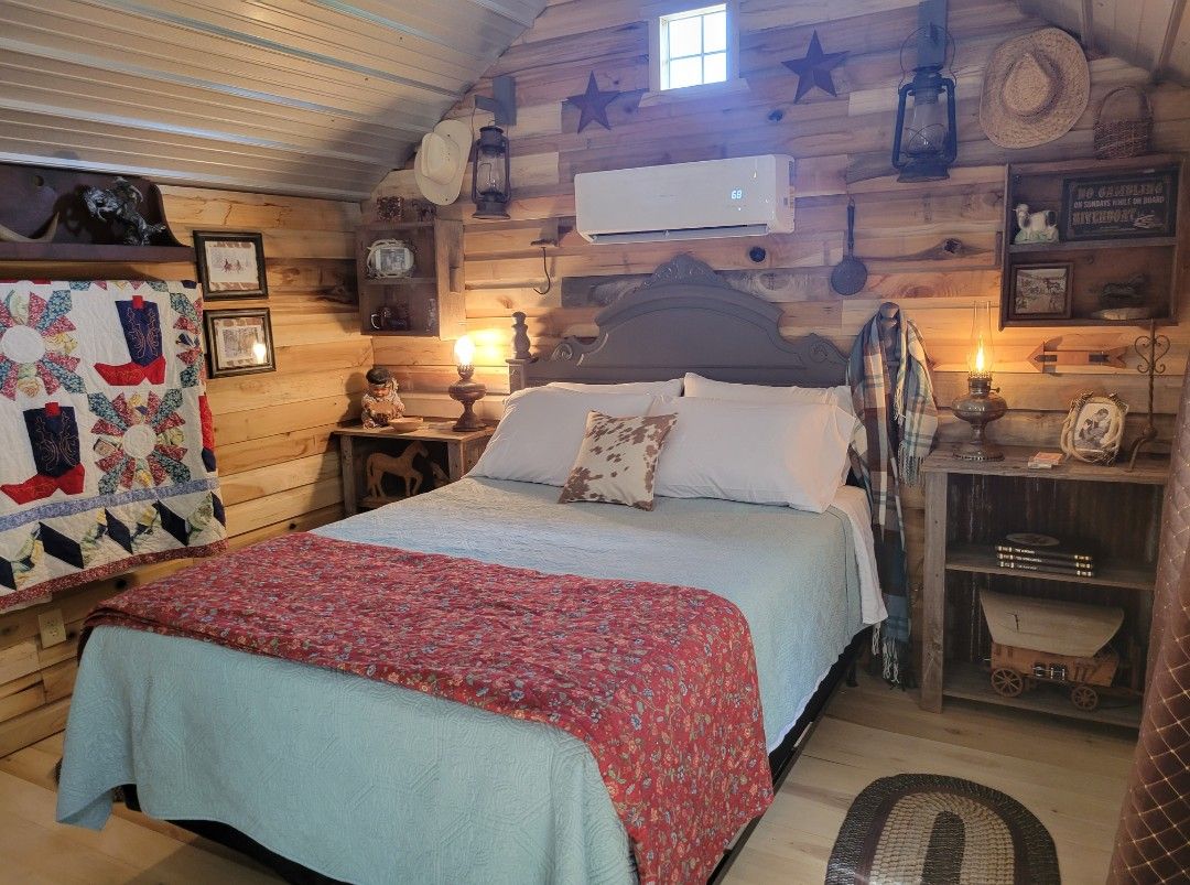 小木屋坐落在清澈的春溪。34英畝的物業上有很多野生動物。小屋有Q尺寸的床(床單/毯子/枕頭)和一個帶軟墊的睡眠閣樓(睡袋/枕頭)。小屋可供2名成人/2名青少年舒適入住。 小廚房配有冰箱/冷凍庫、微波爐、烤麵包機、咖啡壺、碗盤、電鍋、電熱爐。 步行即可抵達Gathering Barn的高速網路。手機服務有限。距離州立公園和田納西河3英里。有很多西方風情