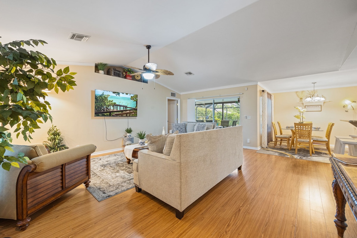 在這個寧靜的住處與家人一起放鬆身心。距離DelPrado僅一個街區,距離Publix、麥當勞、地鐵等僅1/2英里。 距離其他購物不到10分鐘。 北邁爾斯堡海灘(North Fort Myers beach)距離38分鐘路程。 距離Sanibel Island 45分鐘路程。 房子和Lanai非常安靜和私密。但靠近購物或觀光景點! 帶瀑布的泳池正等待您跳入並享受! 在篩選區域的前面喝咖啡。