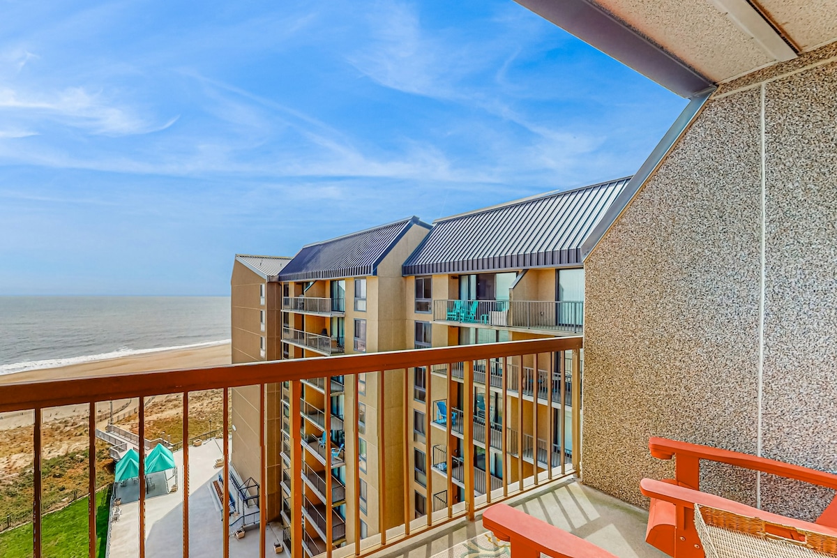 從這間位於Rehoboth Boardwalk安靜地段的2間臥室2間浴室公寓欣賞寬闊的海景。公寓提供最新的廚房、2 張雙人床和一張雙人沙發床,以及 2 間全功能浴室。 我們提供床單和毛巾! 距離Rehoboth市中心、木板步道和海灘僅幾步之遙,位於安全的大樓內,配有泳池、停車位和洗衣設施。您需要的一切,欣賞令人驚嘆的大西洋景觀和沙灘上的完美位置。