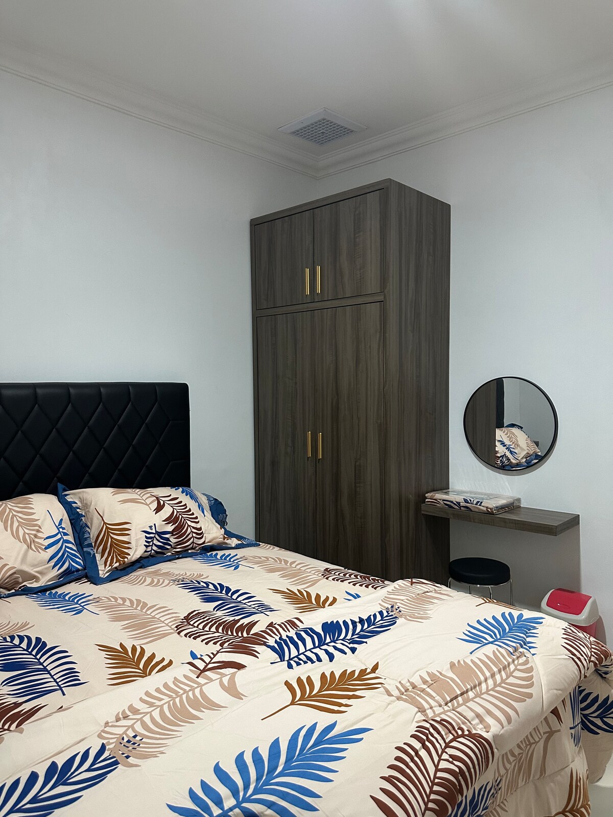 Homestay dengan 2 kamar tidur di lantai dasar, kamar tidur 1 terdapat 2 single bed, kamar tidur 2 terdapat 1 bed besar. Lantai 2 terdapat 3 single bed muat 3 orang. Bisa untuk menginap maksimal 7 orang. Ada dapur, kulkas, air mineral, ruang tamu, kamar mandi 2. Fasilitas kamar mandi: shower, water heater, handuk, sabun mandi, WC duduk.. Fasilitas kamar tidur: AC, sprei, bantal guling, selimut, meja rias, cermin, lemari gantung, nakas, lampu tidur.