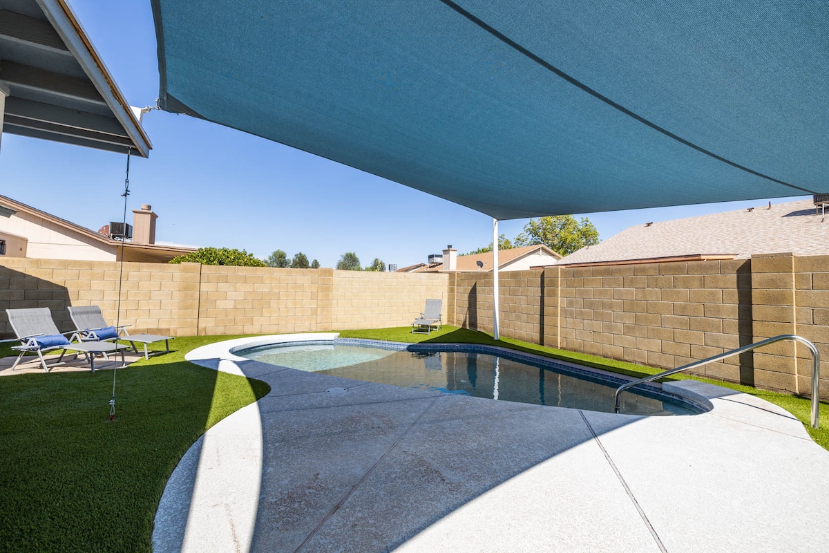 🏊 Heated play pool, 🎯 corn hole, and 🎱 pool table for fun 🏜️ Welcome to this 4BR stylish mid-century modern desert home! ☕ Brew coffee in the open kitchen and enjoy the sunny turf backyard 🔥 Fire up the BBQ while everyone spreads out and relaxes ✨ Spacious, spotless, and packed with comfort—book your Arizona stay now!