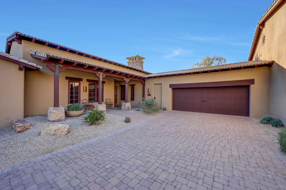 華麗的斯科茨代爾度假勝地!免費溫水泳池/熱水浴缸。 -開放、寬敞的佈局、獨特的建築、拱形木天花板、木地板! -大房間內有壁爐。 -全新廚房電器 -咖啡/瓶裝水。 -浴室配有大理石瓷磚、雙水槽、玻璃淋浴間。 -主浴室配有獨特的浸泡浴缸、步入式衣櫃、通往露臺的法式門。 -免費溫水泳池/按摩浴池。 -半英畝的死胡同。 -戶外廚房、籃球場、乒乓球、馬蹄鐵等
